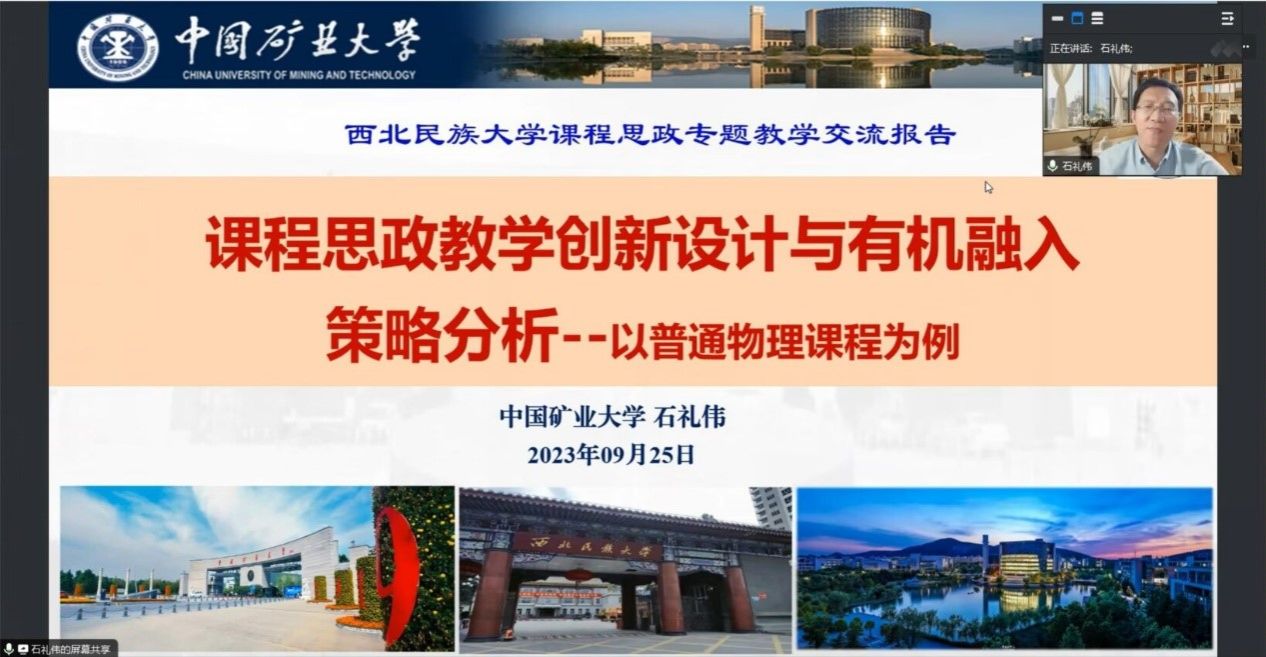 石礼伟教授从中国高等教育的形势与背景出发,面对“教育数字化”转型、新一轮本科教育教学审核评估、“一流本科课程”建设、“教学创新大赛”几个方面阐述了课程思政建设的时代背景和重大意义。石礼伟教授以“融学情”“融理念”“融内容”“融模式”,建设“学习共同体”为核心,系统讲述了如何打造“有温度的教育”,如盐入水的用课程思政滋养学生人格。最后,以全国课程思政示范课程《普通物理》为案例,生动而详实的讲解了教学设计、教学实施、学生活动、资源建设等内容,如何实现课程思政建设走心、走深、走实。
