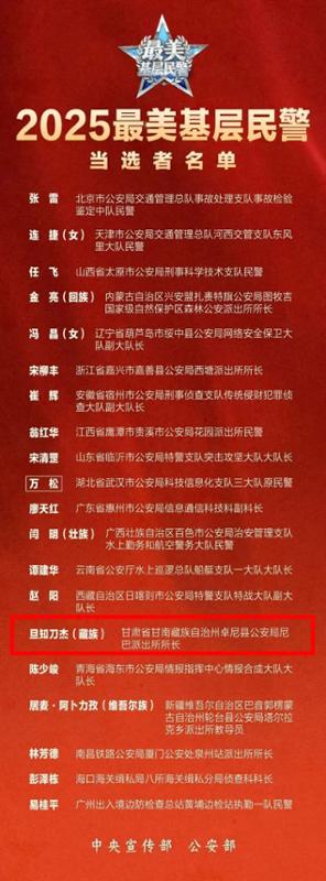 从警十年,旦知刀杰扎根高原牧区,工作中克服各种困难险阻,坚持“警力跟着牧民走,警车随着毡房转”,调解400余起家庭矛盾和草场纠纷。他坚持警力前移,旅游旺季倾力守护中国最美百公里公路——江迭公路40多公里路段,累计参与救援被困车辆300余辆,帮助游客找回手机、随身包、照相机、无人机、戒指等物品210余件。先后荣立个人二等功1次、三等功1次,荣获全省公安机关“成绩突出青年民警”、“甘肃省政法系统优秀典型”、2025甘肃“最美基层民警”称号。