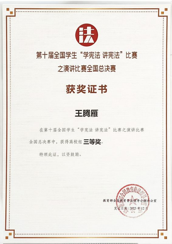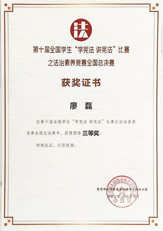 12月1日,第十届全国学生“学宪法 讲宪法”演讲比赛全国总决赛在北京落幕。我院学子表现出色,2023级法学1班廖磊同学(指导老师:钟慧)在法治知识素养竞赛中荣获全国三等奖,2023级法学2班王腾雁同学(指导老师:欧阳兆泰在演讲比赛中荣获全国三等奖。