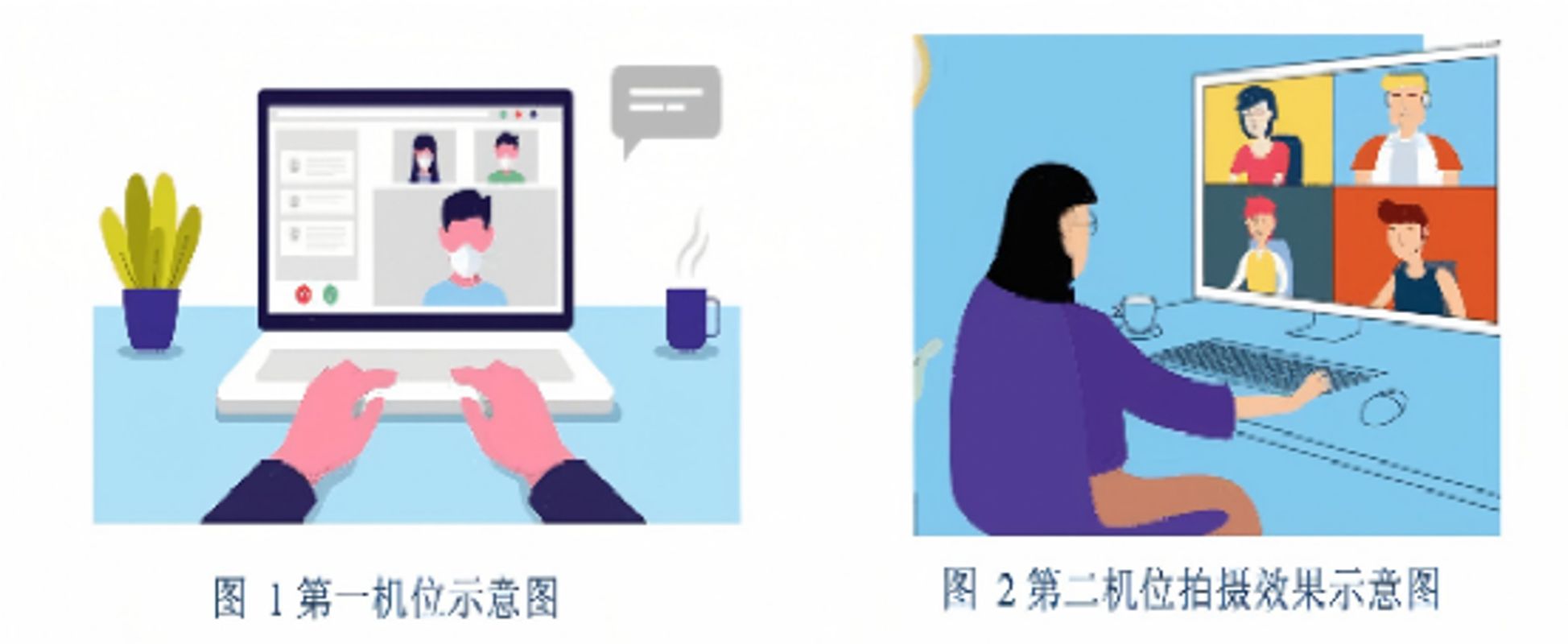 (2)“双机位”摆放要求:笔记本电脑(第一机位)从正面拍摄,放置在距离本人30cm左右处,手机(第二机位)从考生侧后方45°距离本人30cm左右处拍摄,确保第一机位和第二机位分别从考生面前和身后完整拍摄到考生全身、面试小组能够从第二机位清晰地看到第一机位屏幕。第一机位和第二机位须两个账号分别登录,效果图如下。