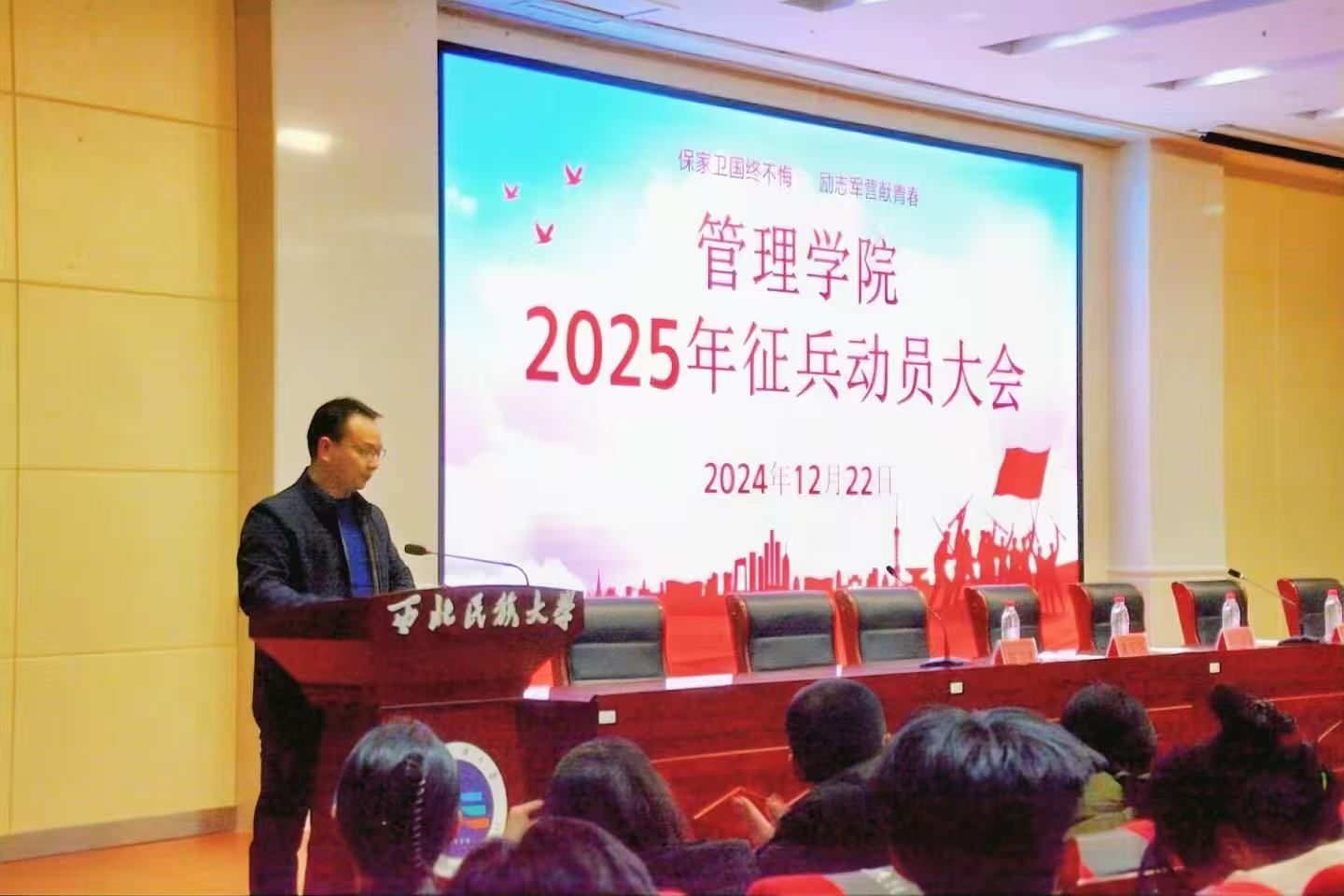 12月22日,管理学院在榆中校区致真楼125学术报告厅召开2025年征兵动员大会。学生工作部部长刘曜,保卫工作部副部长冉璐、保卫工作部国防教育办公室主任黄首华,管理学院负责人向党、米尔古丽,北京广慧金通集团驻西北民族大学工作处主任陈丽雯,以及管理学院班导师、辅导员代表,各班综治员、300名学生代表参加会议。