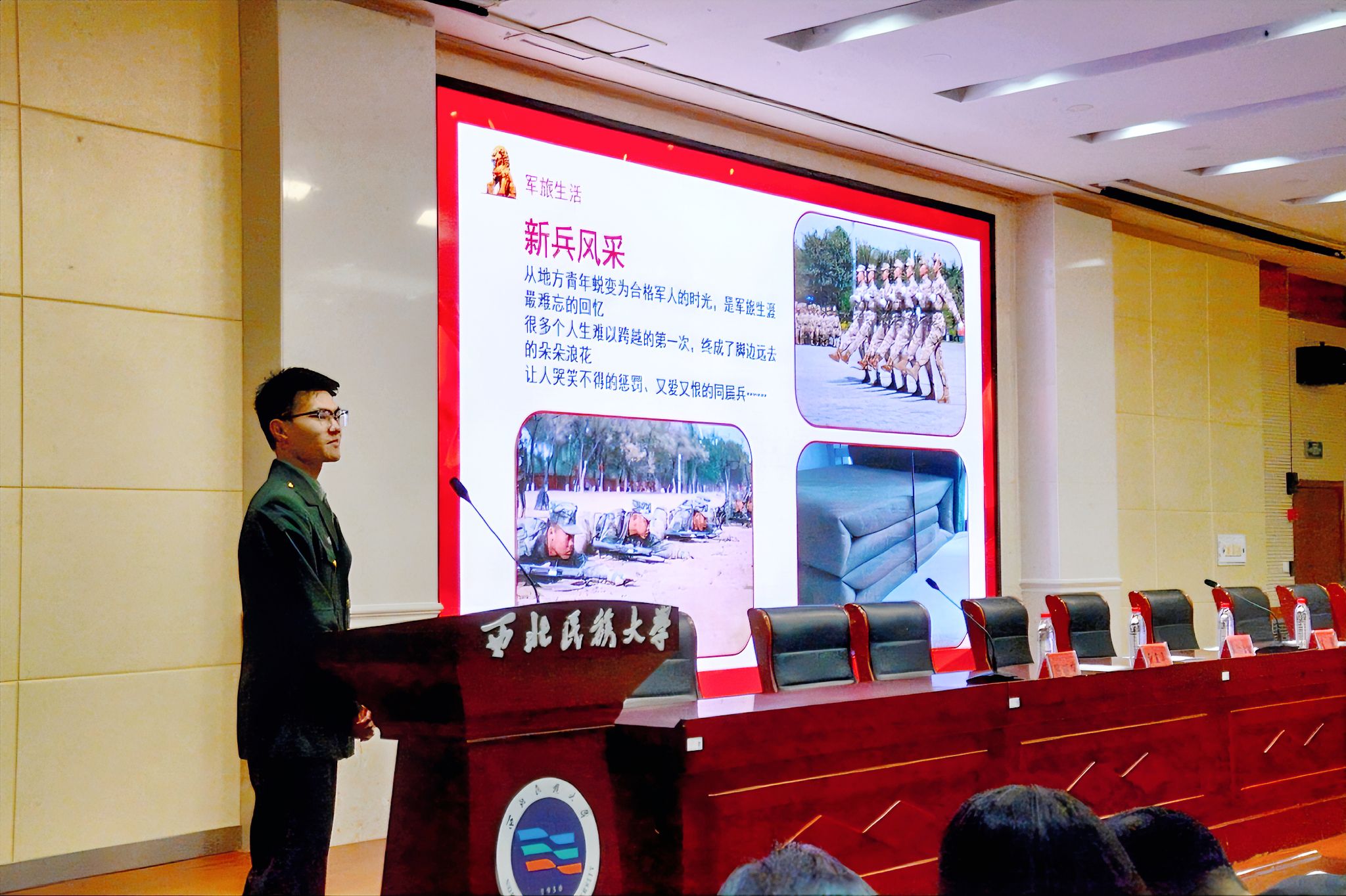 退役优秀学生代表陈垣臻首先和大家分享了独特而难忘的军旅学习、训练、生活经历,精彩交流自己军事理论学习、体能训练、技能训练、心理素质训练和内务管理、集体生活、文化活动情况,以及服役期间的成长与收获:锻炼了意志品质,提升了团队协作能力,增强了责任感、使命感、荣誉感,成长为坚强而有担当的新时代大学生。