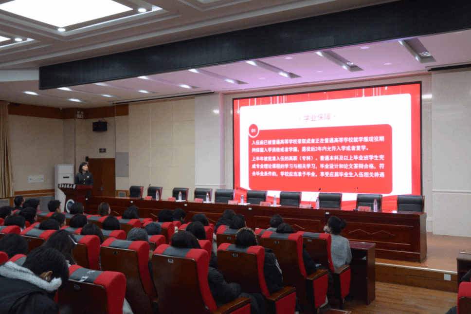 紧接着,学校国防教育先锋团队员、退役优秀学生代表王腾雁从经济、教育、就业、医疗、交通、住房、家属、荣誉表彰、艰边地区服役等方面,图文并茂宣讲入伍优待政策,号召同学们投笔从戎,亲身感受军营生活的多样性、军旅生活的不一般意义,为国防事业、军队建设贡献自己的青春和力量。