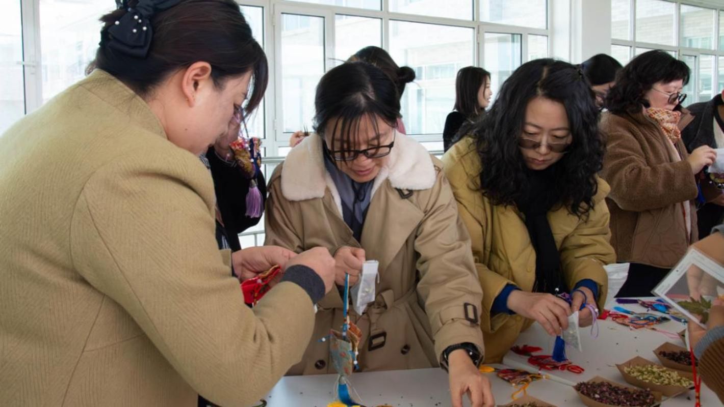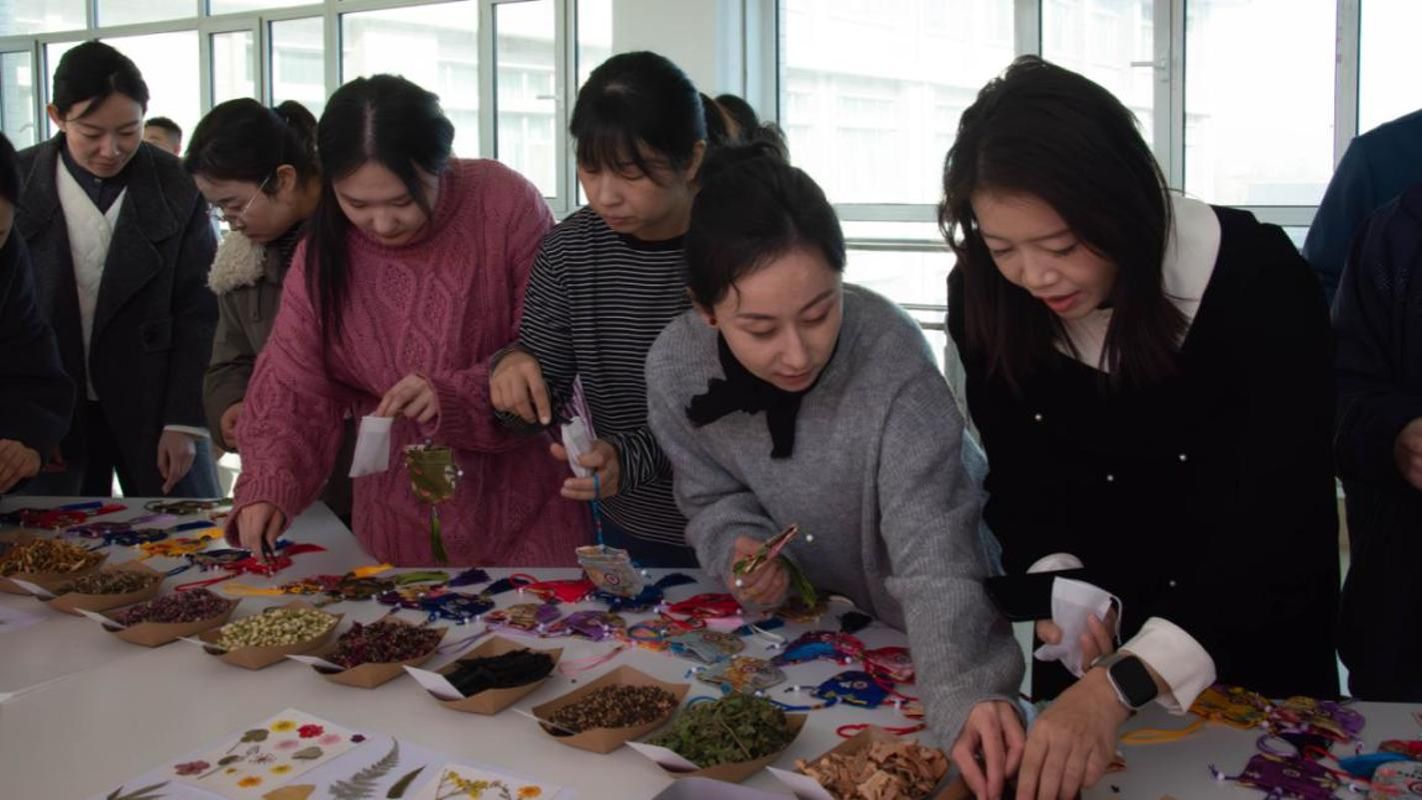 活动现场其乐融融。学院党委副书记、工会主席米尔古丽首先为大家详细讲解秋叶书签与香囊的制作流程。随后,老师们或利用拾捡的校园秋日“碎片”,以巧思匠心将落叶、干花精心装帧于透明相框内,制作成一枚枚精致的书签;或手持锦缎香囊袋,将薰衣草、桂枝、玫瑰、茉莉等十余种香料随心组合,装填出一只只芬芳的香囊。一枚枚书签,夹住的是学校七十五载的芳华记忆;一只只香囊,寄托的是学校奋进新征程的美好祝愿。教职工们在动手实践中相互协作、彼此切磋,在轻松愉快的氛围中分享校园记忆、传递爱校情怀,于细微处见古人“修身齐家”的生活哲学,传承弘扬中华优秀传统文化。