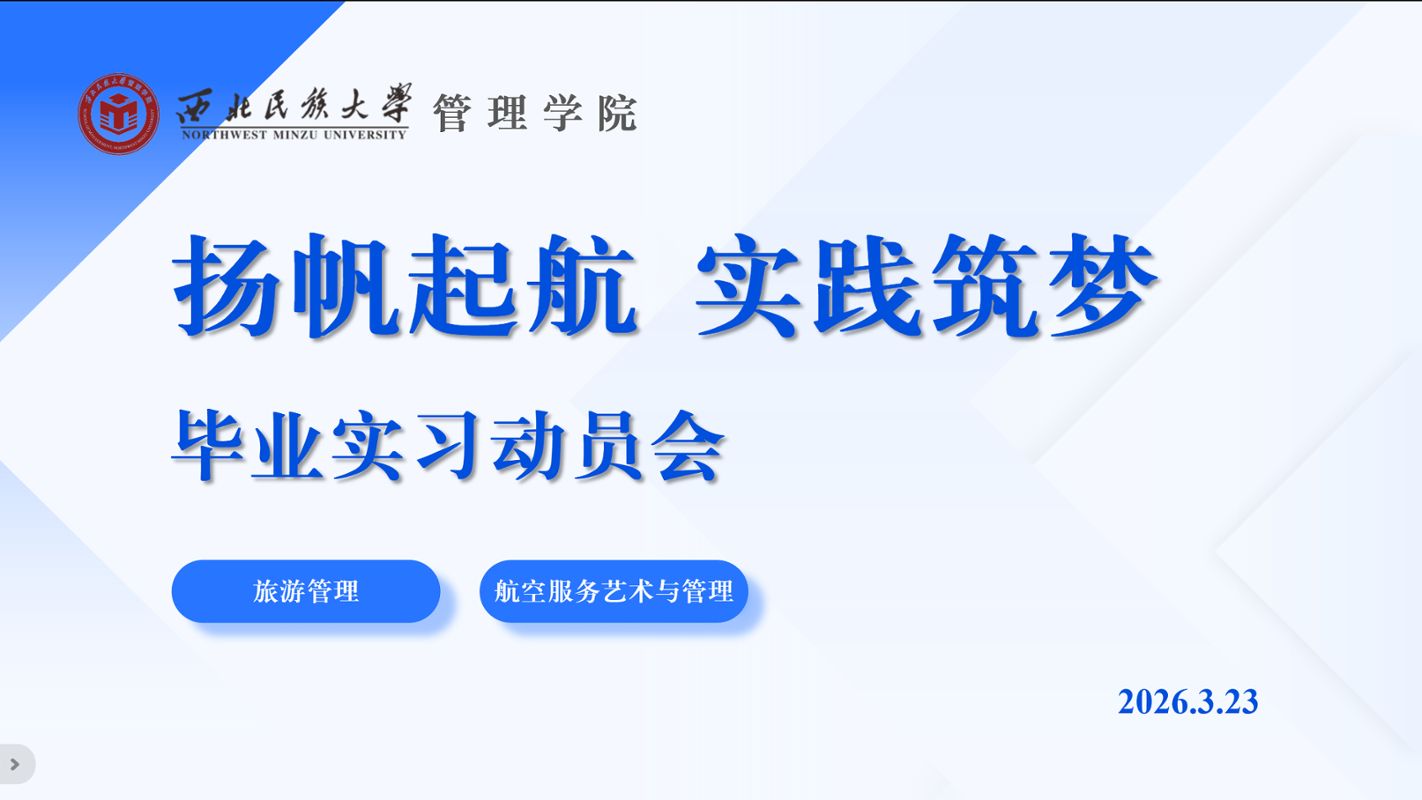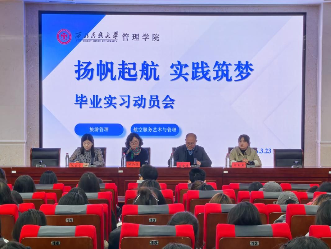 为增强实践育人成效,引导毕业生明确实习方向、明晰职业规划,近日管理学院在榆中校区致真楼学术报告厅召开“扬帆起航实践筑梦”旅游管理专业、航空服务艺术与管理专业毕业实习动员会。管理学院副院长谢宗棠、旅游管理专业系主任邹品佳、航空服务艺术与管理专业系主任付春燕、广慧金通教育集团驻校工作处主任陈丽雯和毕业班班导师出席,2027届旅游管理专业、航空服务艺术与管理专业全体毕业生参加。