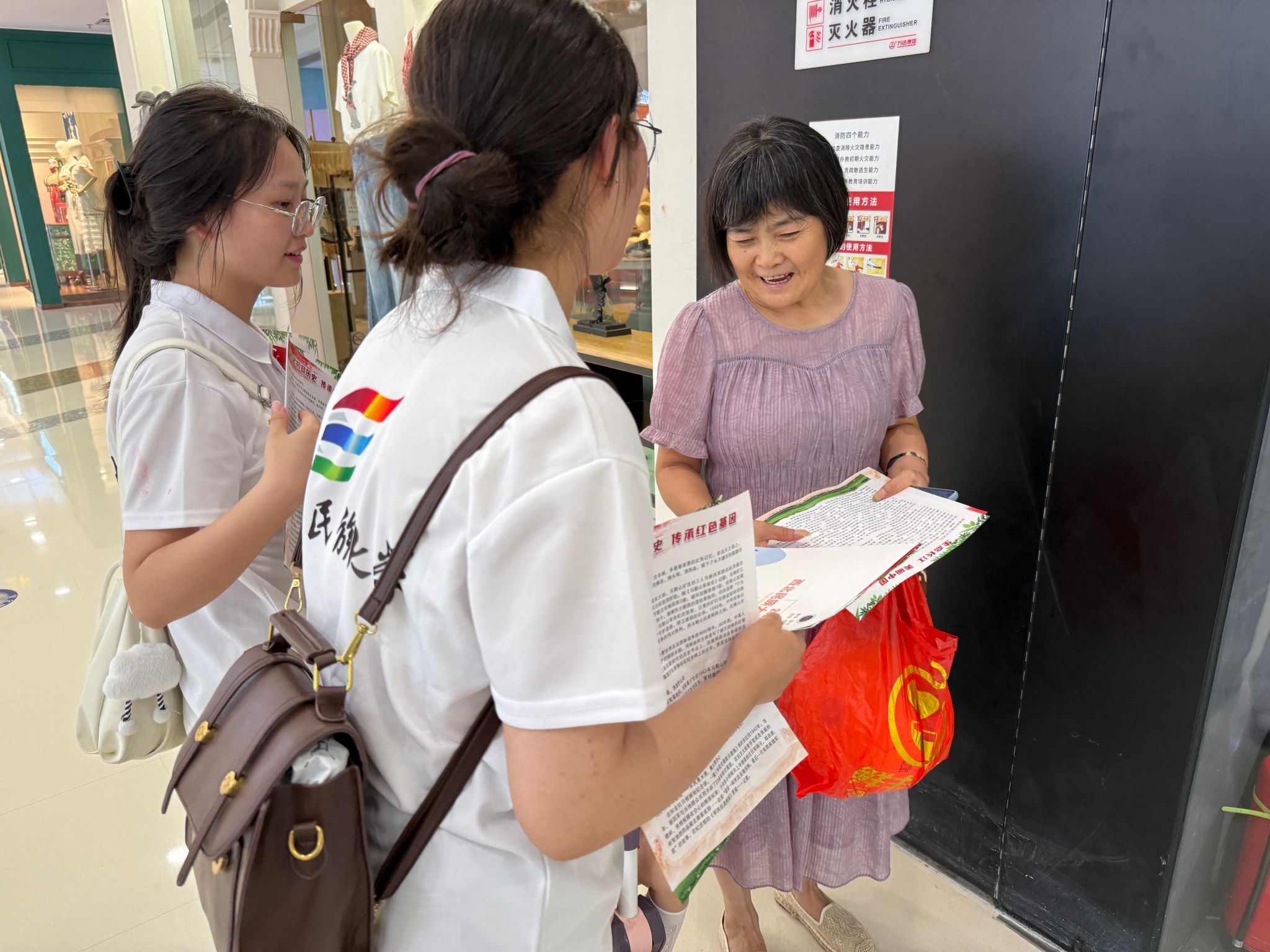 8月24日下午,实践团成员在马鞍山博物馆、图书馆、科技馆、太白金街等繁华热闹地段,向当地群众进行学校招生、抗战胜利80周年、绿色环保宣传活动,反响热烈。宣讲过程中,当地市民群众、初高中生主动与队员们交流,咨询学校招生录取情况,表示很大兴趣。