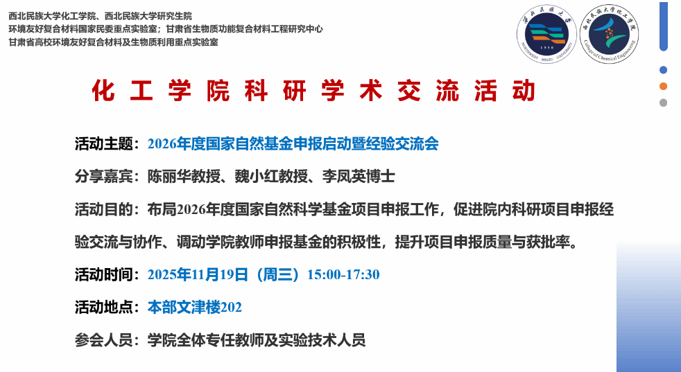 本次启动会标志着化工学院2026年度国家自然科学基金申报工作全面开启。学院将继续依托环境友好复合材料国家民委重点实验室、甘肃省生物质功能复合材料工程研究中心、甘肃省高校环境友好复合材料及生物质利用重点实验室、甘肃省表面化学基础学科研究中心等高水平科研平台,后续将通过组织针对性预评审等系列举措,为全体教师的基金申报工作提供全力支持与保障,共同推动学院科研工作再上新台阶。