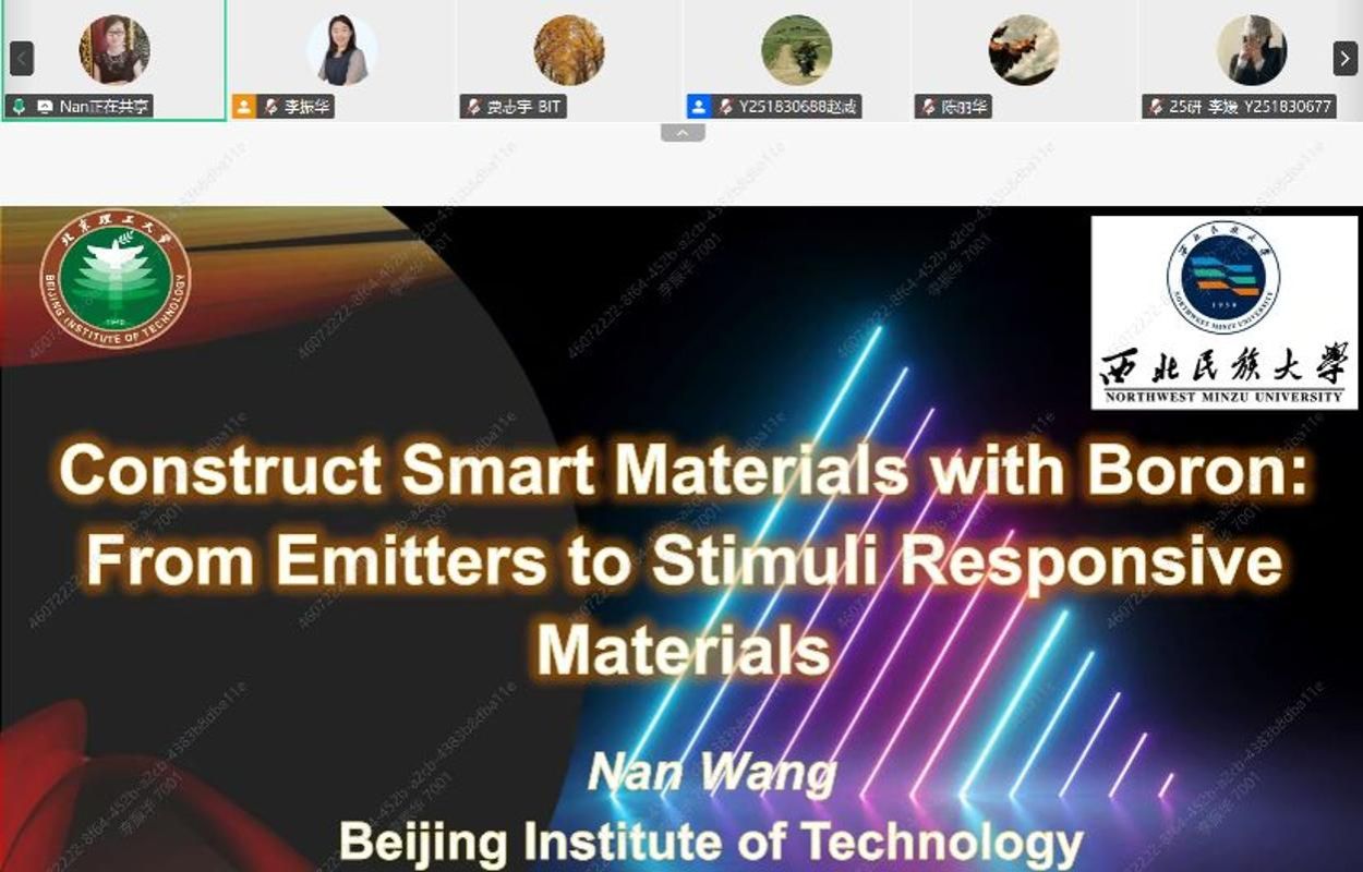 近日,北京理工大学化学化工学院王楠副教授应我院邀请,为我校师生作了题为《有机硼功能分子:从新反应到新材料》的精彩学术报告。报告通过线上方式举行,吸引了三百名师生在线参与交流。
