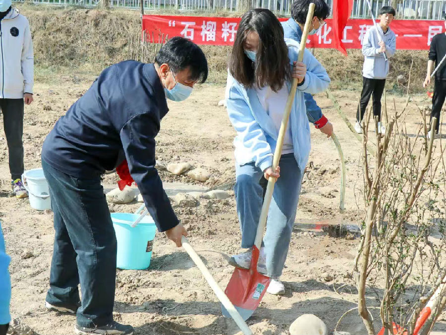 活动现场,生命科学与工程学院院长臧荣鑫向师生讲解石榴树种植技巧和注意事项,参与植树的师生分工协作,整地挖坑、栽植树苗、挥锹培土、提水浇灌,各道工序有条不紊,现场一派热火朝天的劳动景象。经过近两个小时的劳动,三十棵石榴树在美丽的民大石榴园“安家落户”,一棵棵新栽的树苗昂然挺立,在春风的吹拂下焕发出盎然生机,为校园春色点染出一抹新意。