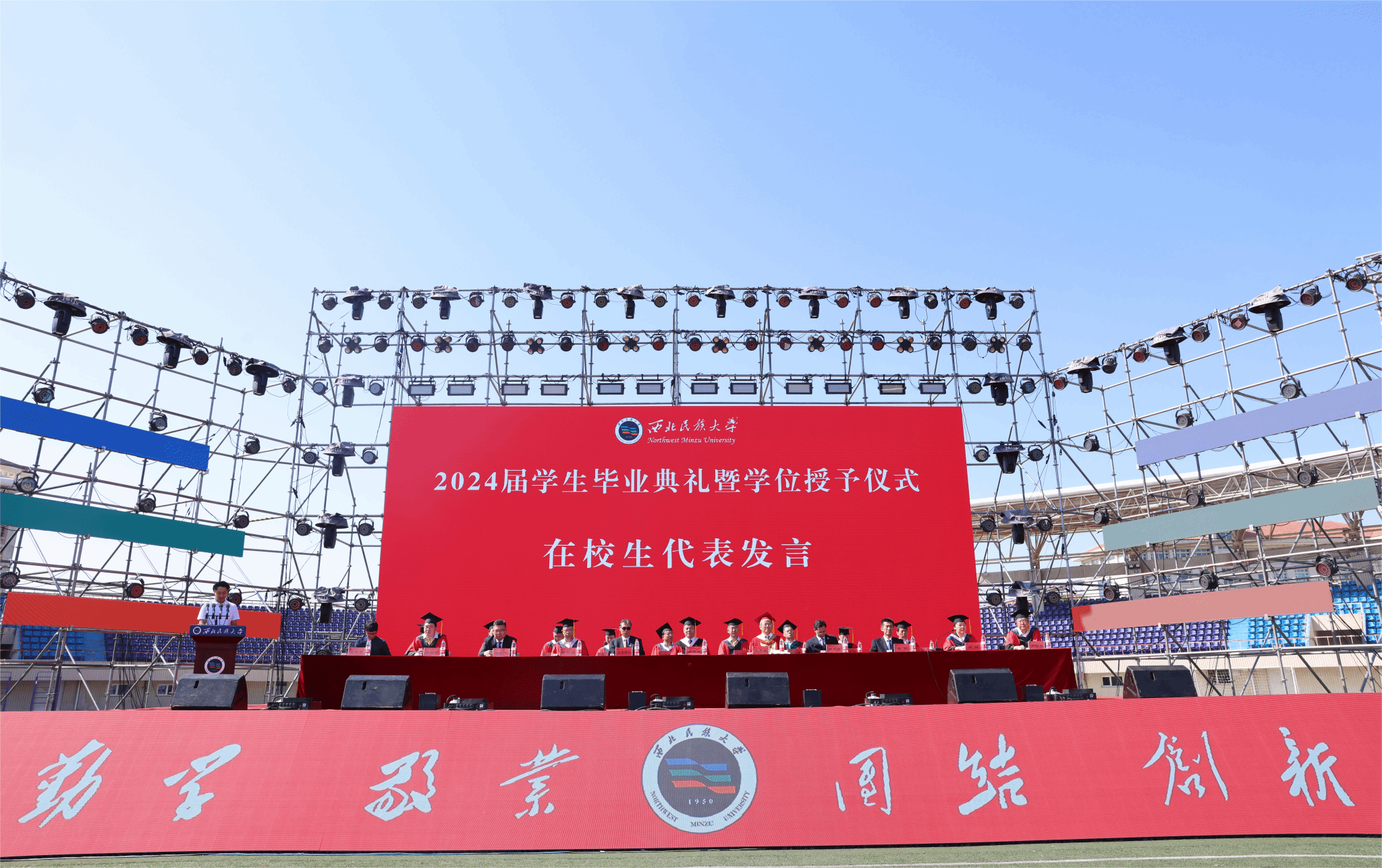校学位评定委员会副主席、副校长陈永奎宣读《西北民族大学2024届毕业生毕业及学位授予的决定》。毕业生代表、在校生代表、教师代表、优秀校友代表依次发言,向2024届毕业生致以最真诚的祝福和殷切的期望。