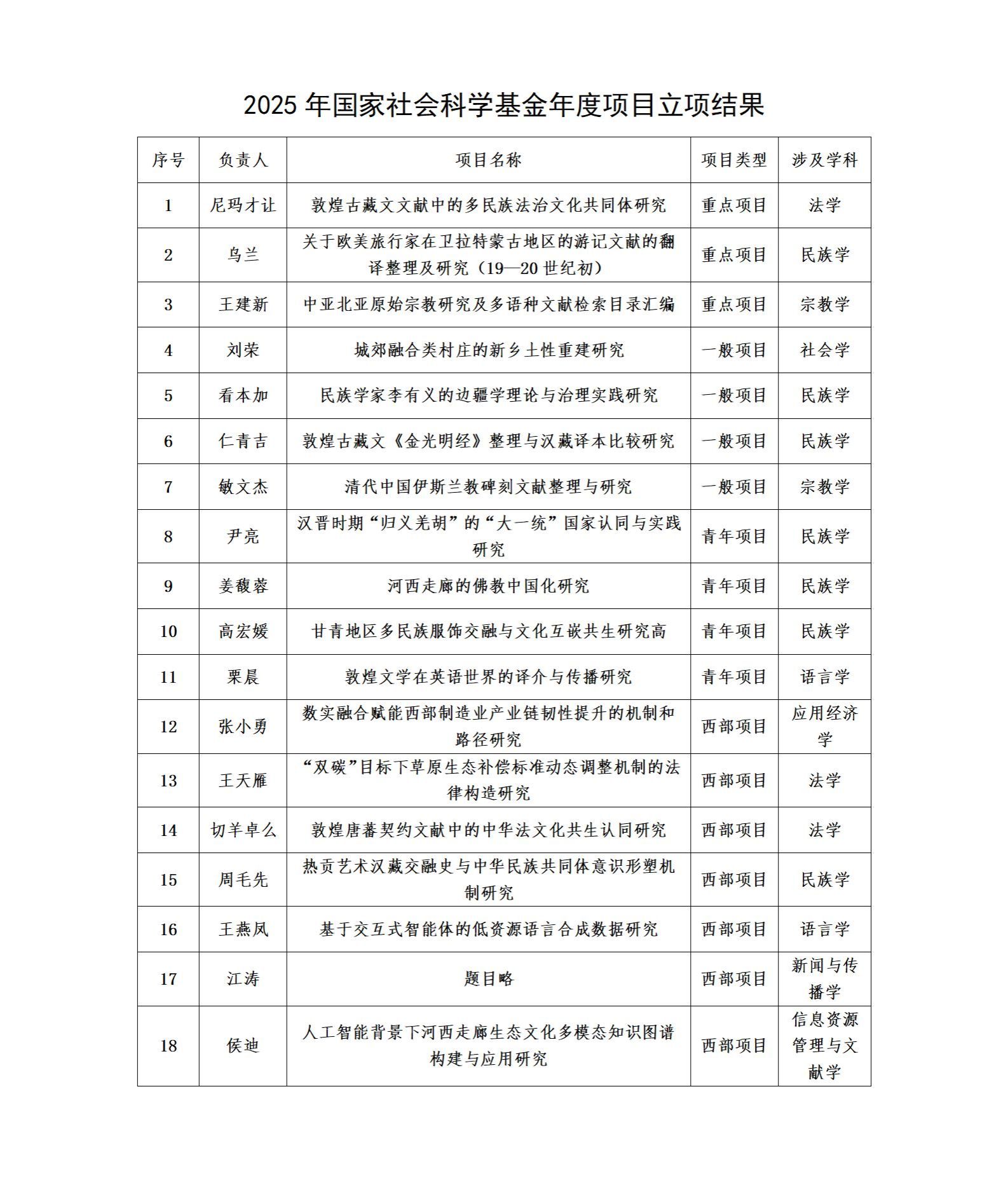 获批项目紧密围绕国家战略方向,聚焦铸牢中华民族共同体意识、敦煌文献整理与研究、宗教中国化、民族文化交融、数实融合等一系列重大议题,涵盖民族学、法学、语言学、应用经济学、社会学、宗教学、新闻传播学等多个学科,充分体现了学校哲学社会科学研究的特色优势和学术影响力。