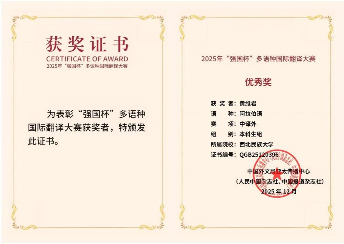 近日,我校学生在2025年“强国杯”多语种国际翻译大赛中斩获佳绩。其中,阿拉伯语系2024级钱泽宇、黄维君两名同学分获本科生组二等奖和优秀奖;2024级阿拉伯语笔译杨恩霖、柳佳斌两名同学分获研究生组二等奖、三等奖,凯丽比努尔·热合曼、陈京国、马赛力等同学获研究生组优秀奖。