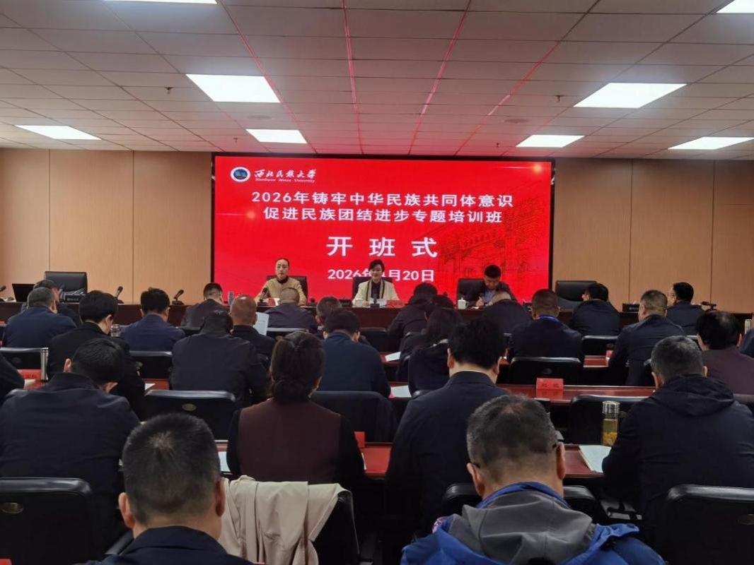 4月20日上午,由甘肃省委组织部主办,甘肃省委统战部、甘肃省民族事务委员会协办,西北民族大学承办的2026年铸牢中华民族共同体意识促进民族团结进步专题培训班在榆中校区开班。甘肃省委统战部有关负责同志,学校党委组织部、继续教育学院主要负责同志参加开班式。
