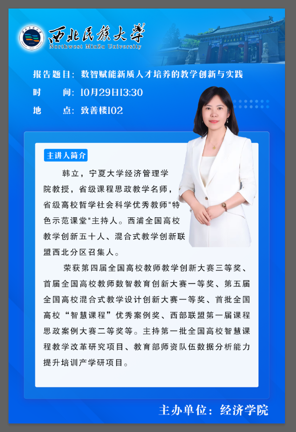 1.专家报告:特邀韩立教授作题为《数智赋能新质人才培养的教学创新与实践》的专题报告,时间13:30,地点致善楼102;