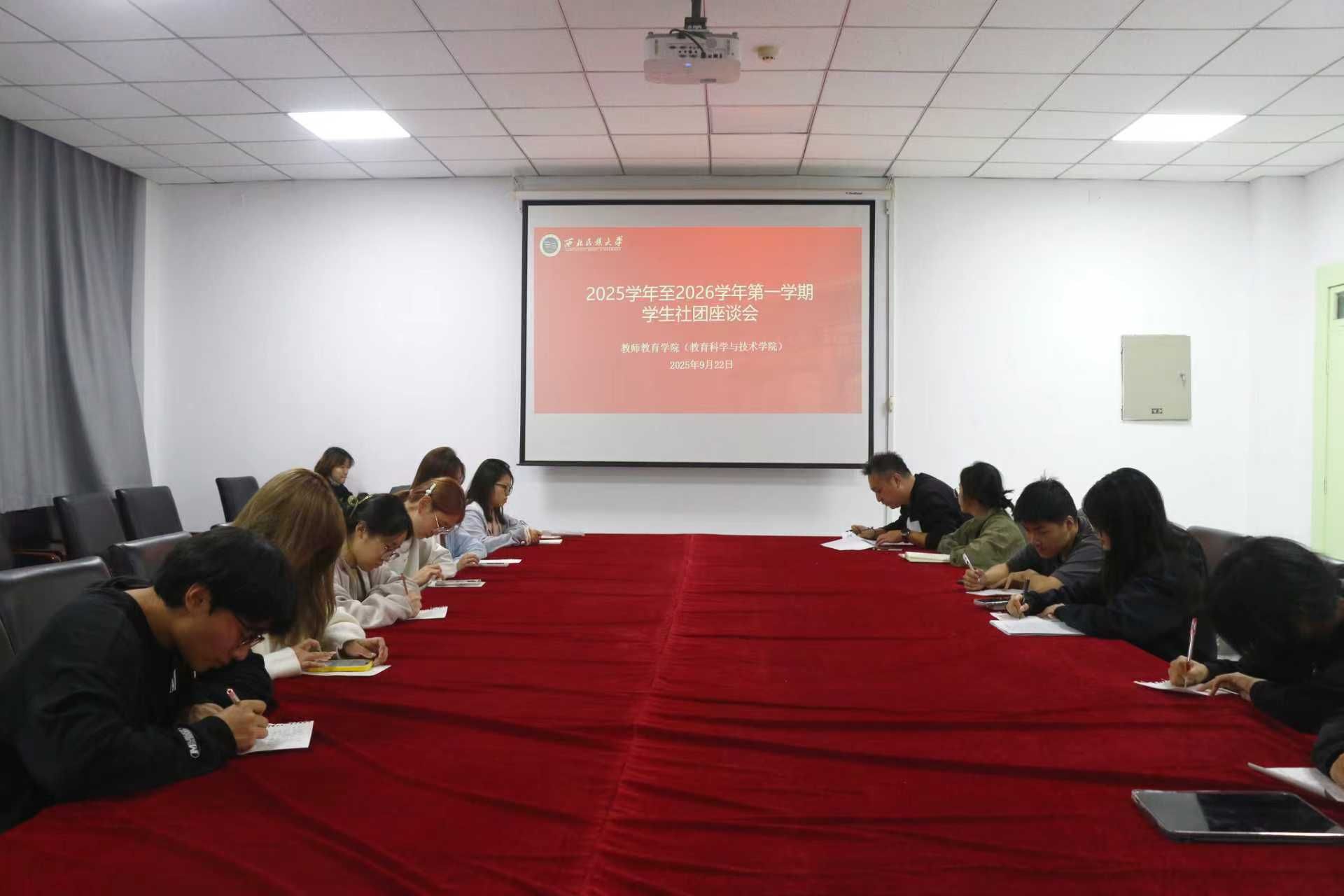 2025年9月22日,教师教育学院(教育科学与技术学院)以线上线下相结合的方式召开2025年学生社团工作座谈会。学院党委副书记王鹏、社团指导老师、挂靠社团骨干学生及学院学生会负责同学参加会议。团委书记高洁主持会议。