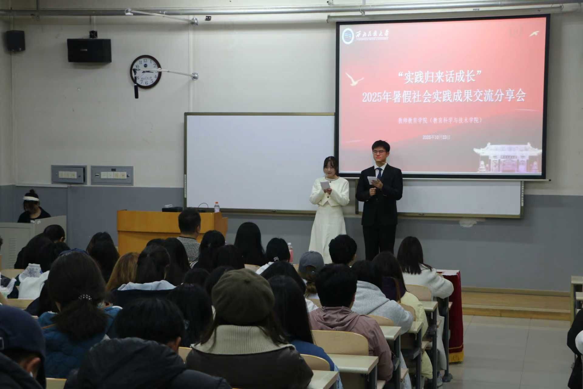 2025年10月23日,教师教育学院(教育科学与技术学院)在致真楼407成功举办了“实践归来话成长”2025年暑期社会实践成果交流分享会。学院党委副书记王鹏,学院团委书记高洁老师及全体2025级新生、高年级学生代表齐聚一堂,共同聆听青年学子讲述实践故事。