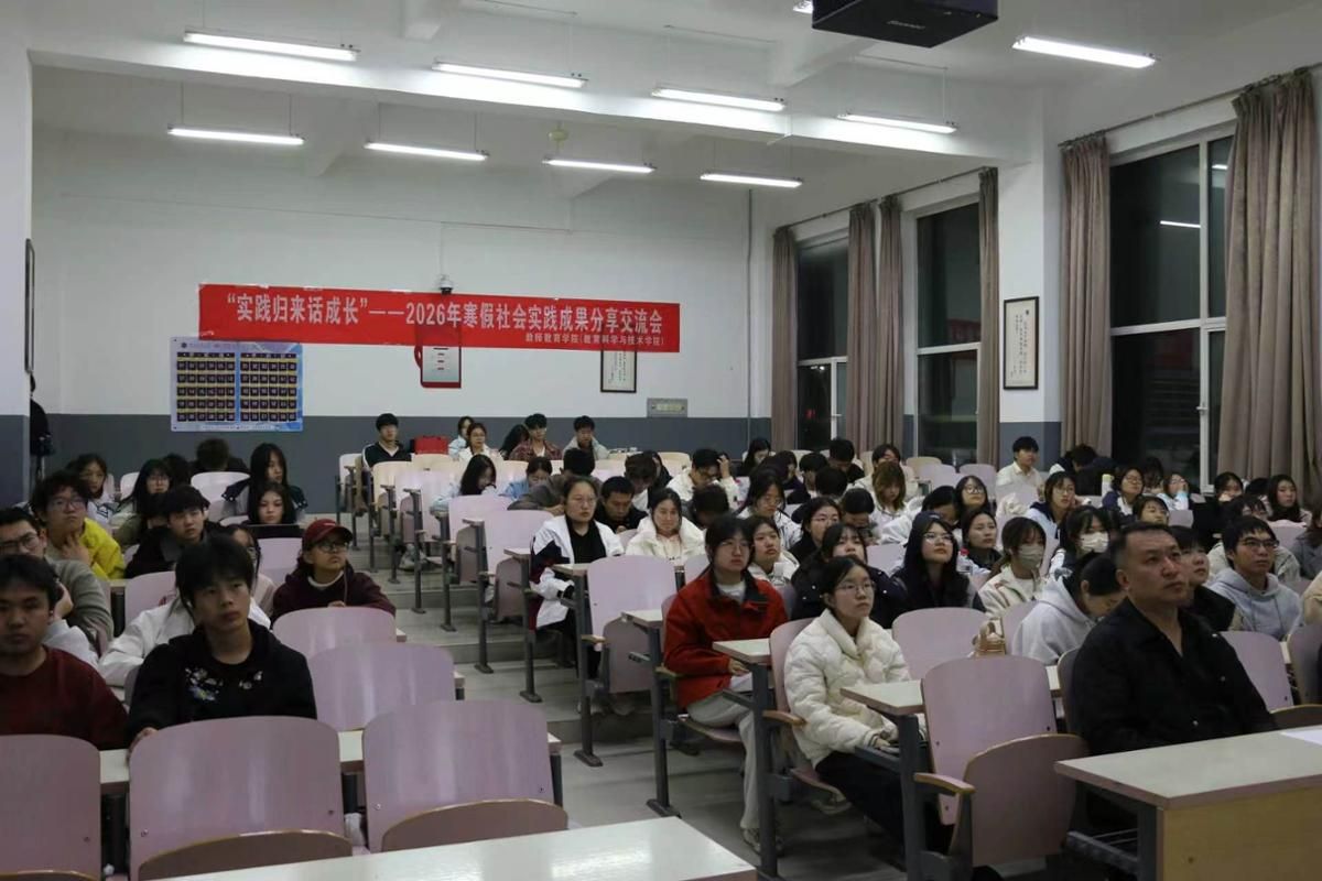 近日,教师教育学院(教育科学与技术学院)在致真楼105举办“实践归来话成长”——2026年寒假社会实践成果分享交流会。学院党委副书记王鹏、团委书记高洁出席,全院各年级学生代表100余人参与。