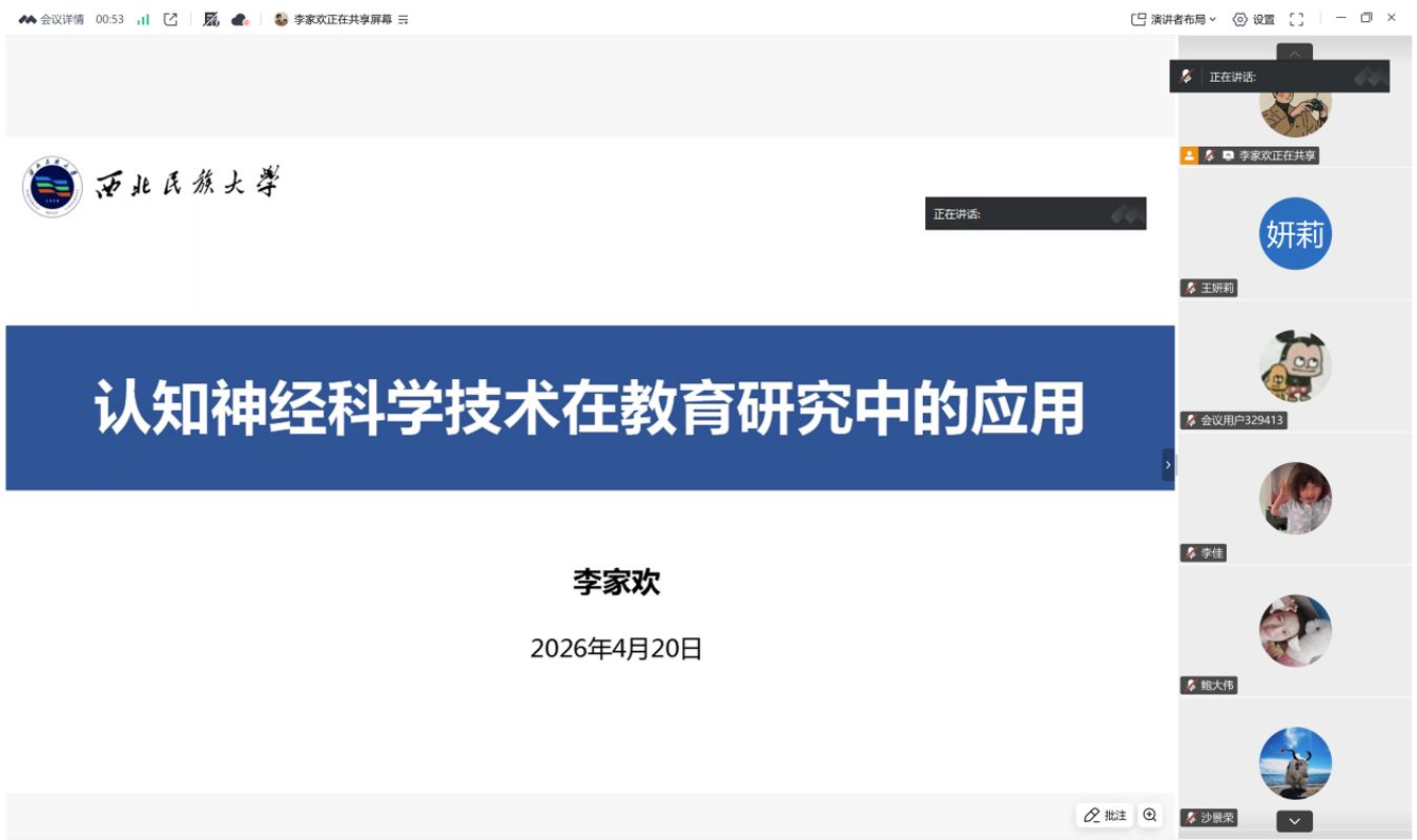 本期分享会由学院副院长王妍莉教授主持。2024级教育学专业研究生李家欢同学以《认知神经科学技术在教育研究中的应用》为主题作了分享。李家欢同学从认知神经科学核心概念入手,梳理了脑电技术(EEG)在教育研究领域的应用价值,分析了学习过程分析、注意力机制研究、个性化教学策略设计等实践案例。现场师生围绕认知神经科学对教学策略优化的指导作用、技术在教育评价中的应用前景等关键问题展开深入研讨,交流氛围热烈,互动成效显著。