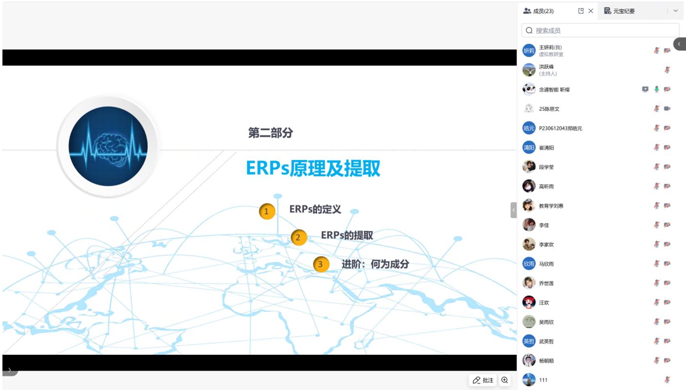 本次分享会由学院尕藏草教授主持,活动聚焦脑电设备的实操训练和数据分析,特邀上海念通智能科技有限公司资深技术工程师、电子信息工程学士、认知心理学硕士靳璨在线交流指导。活动围绕脑电信号基础原理、事件相关电位(ERP)定义、实验设计规范等内容展开,现场演示数据预处理全流程,针对研究生在科研实践中遇到的数据分析难题进行精准答疑,并以李家欢同学的研究数据为例展开点评,提供优化思路与改进方案。