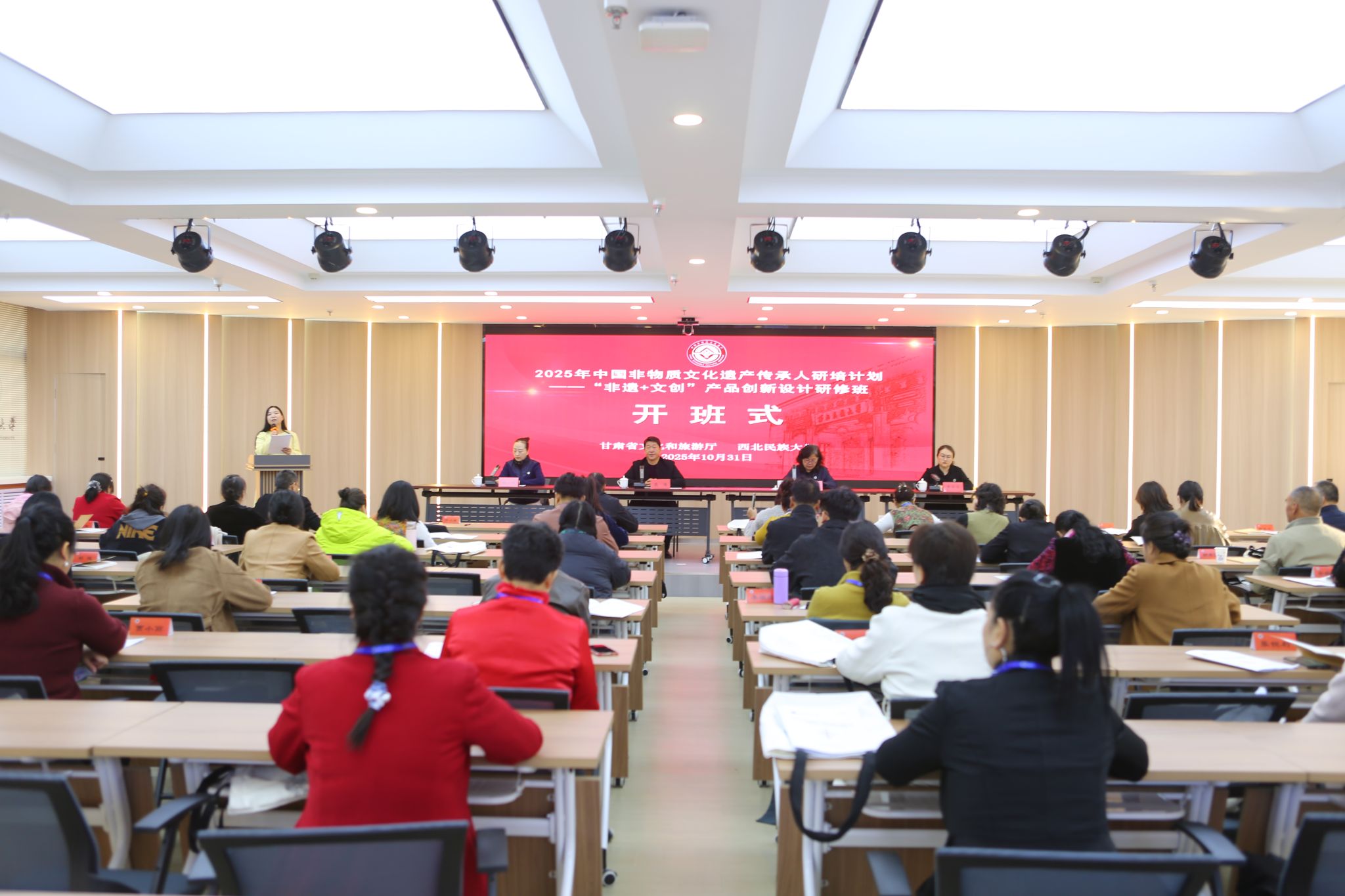 10月31日,由甘肃省文化和旅游厅主办,西北民族大学承办的2025年中国非物质文化遗产传承人研培计划——甘肃传统工艺品牌建设研修班、“非遗+文创”产品创新设计研修班在学校开班。甘肃省文化和旅游厅非物质文化遗产处相关负责人和学校美术学院、继续教育学院主要负责人及来自全省的50名非遗传承人与非遗工坊从业人员参加开班式。