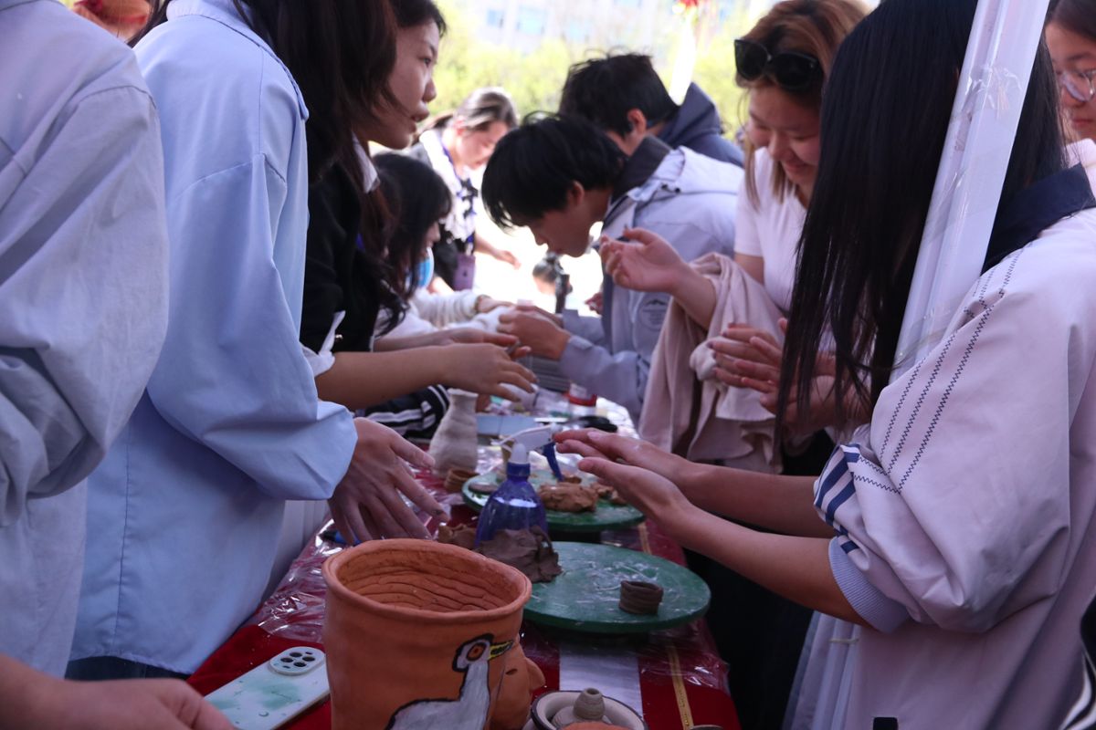陶器制作体验区里,师生们亲手揉捏陶泥、塑形雕琢,仿照古代陶器形制打造专属手工陶艺作品,在指尖的触感中体悟古代制陶工艺的深厚底蕴与古人的匠心智慧。