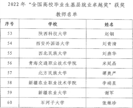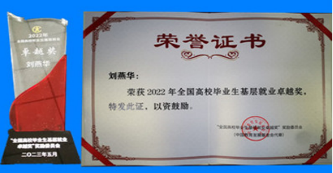 2023年1月,教育部部署各地各高校开展首届“全国高校毕业生基层就业卓越奖”推荐活动,经高校组织推荐、各省级教育行政部门遴选推荐、“全国高校毕业生基层就业卓越奖”奖励委员会复核确认,公示无异议后,共评选出优秀指导教师60人、优秀高校毕业生398人。