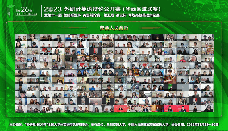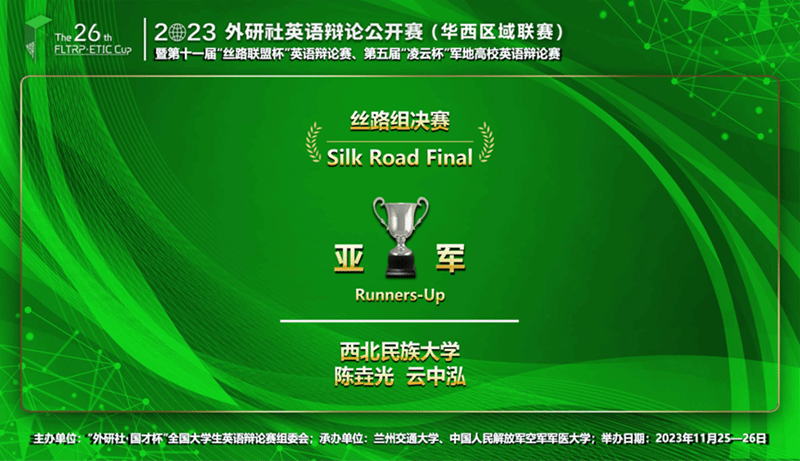 11月25-26日,由学校推选的四支辩论队在2023外研社英语辩论公开赛(华西区域联赛)暨第十一届“丝路联盟杯”英语辩论赛、第五届“凌云杯”军地高校英语辩论赛中获得佳绩。其中,一支辩论队获得丝路高校组亚军(一等奖),三支辩论队获得丝路高校组三等奖。