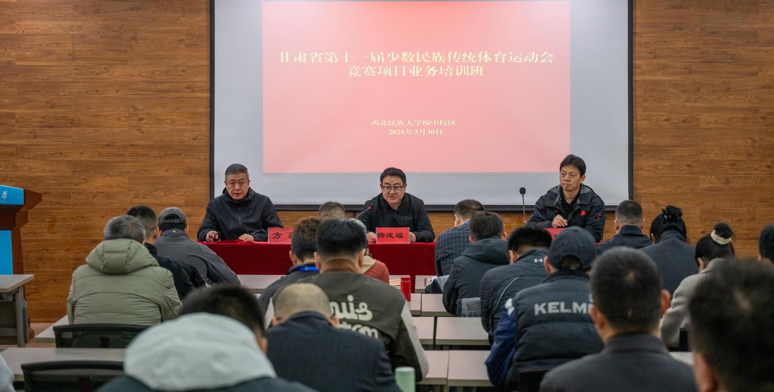 3月30日上午,甘肃省第十一届少数民族传统体育运动会竞赛项目培训班开班仪式在我校举行。来自全省14个市州和兰州新区、兰州大学、西北民族大学、西北师范大学、甘肃民族师范学院的80余名参训学员齐聚我校,开启为期4天的专项学习之旅。