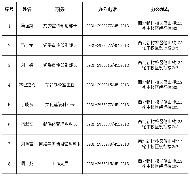 党委宣传部是负责学校思想政治教育、意识形态工作、宣传思想文化工作的职能部门。其主要职责是:贯彻落实新时代党对宣传思想文化工作的方针政策,执行上级部门决策部署以及学校各项决议决定,旗帜鲜明开展民族领域意识形态斗争,讲好中国故事;负责制定完善宣传思想工作相关制度体系,制定宣传思想文化年度工作计划并组织实施;负责研究、宣传马克思主义中国化最新成果、党的重大战略部署和重大方针政策,组织学校党委理论学习中心组学习,协调、指导、监督二级单位党组织理论学习中心组开展相关工作;统筹校园文化建设,开展精神文明建设、普法宣传教育等工作,加强师生员工思想政治教育工作;负责统筹协调意识形态工作,监督检查各单位及党员领导干部意识形态工作责任制落实情况;负责统筹指导舆情信息工作,指导监管校园网络平台内容的建设和校内外新闻的宣传工作,统筹协调新媒体建设与管理;负责《西北民族大学报》的编辑、出版和发行工作;完成学校交办的其他工作任务。