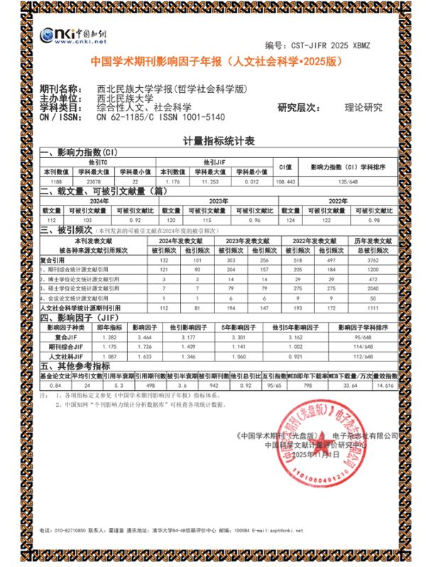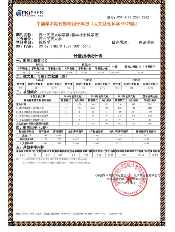 据中国科学文献计量评价研究中心与清华大学图书馆联合编撰的《中国学术期刊影响因子年报(人文社会科学・2025 版)》数据显示,《西北民族大学学报(哲学社会科学版)》无论是在民族学学科类目,还是综合性人文、社会科学学科类目中,影响因子均持续提升,期刊的学术影响力也进一步增强。
