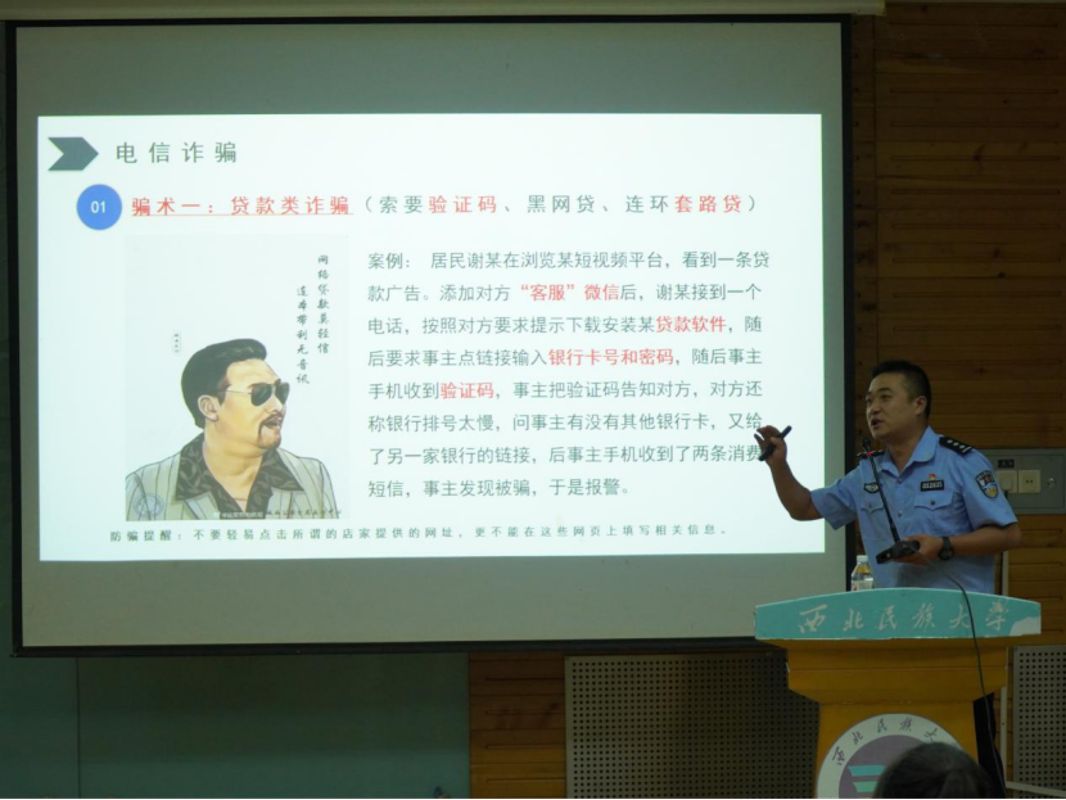 报告环节中,陈警官结合当前电信网络诈骗高发态势,以真实典型案例为切入点,用通俗易懂的语言拆解“校园贷”“刷单返利”“冒充客服退款”“虚假中奖”等常见诈骗手段的作案流程与隐蔽陷阱,让在场新生直观认清诈骗分子的套路。针对学生群体社会经验较少、防范意识薄弱、风险识别能力不足的特点,他重点聚焦网络社交、线上购物、信息注册等高频场景,明确安全注意事项:提醒师生切勿泄露身份证号、银行卡号、验证码等敏感信息,坚决不点击陌生链接、不下载非官方APP,遇可疑情况第一时间联系学校保卫部门或公安机关求助。此外,陈警官现场推广实用反诈工具,详细演示“国家反诈中心”APP的下载、实名认证及来电预警、短信拦截等功能操作,指导师生通过微信注册“金钟罩”反诈小程序,讲解其诈骗预警推送、反诈知识学习、一键求助等作用,帮助师生构建“APP+小程序”双重防护体系。