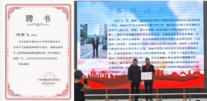 本次科学活动在震撼的无人机表演和学生热烈的欢呼声中拉开了序幕,首先西北新村小学副校长张多军致辞,明确了本次活动的重要意义,并对学生提出了殷切希望。会上,张多军宣读了兰州市城关区教育局聘任生物医学研究中心教授冯若飞为该校科学副校长的决定,并由该校书记张建民为冯若飞颁发了聘书。