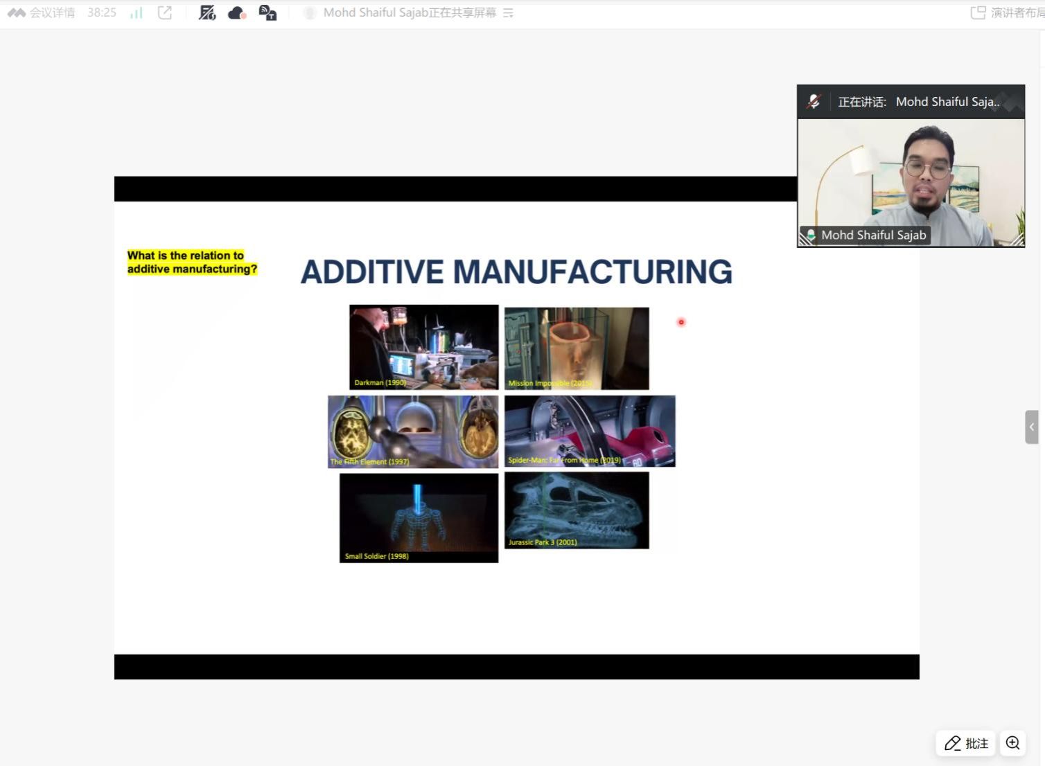 报告会上,Mohd Shaiful副教授全面介绍了木质素和纤维素等生物基材料在3D打印领域的最新研究进展,系统讲解了马来西亚棕榈生物质的利用现状、生物聚合物的制备方法及可持续性优势,并重点阐述了生物质基聚合物的成分分析、性能评价、降解特性及其在增材制造中的应用潜力。报告中还展示了团队在木质素功能化、纳米纤维素增强复合材料、可回收PBS 3D打印材料等方面的技术创新与应用成果,并介绍了相关材料在环保高值化利用、绿色制造和新型复合材料开发中的产业化前景。