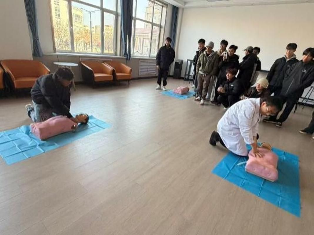 在陈老师的悉心指导下,学生们分组进行了实操练习。大家认真聆听要点,积极上手体验,反复练习按压手法与节奏,努力掌握这项“黄金四分钟”内的救命技术。许多同学表示,这是他们第一次如此近距离地学习和接触急救技能,感到受益匪浅。