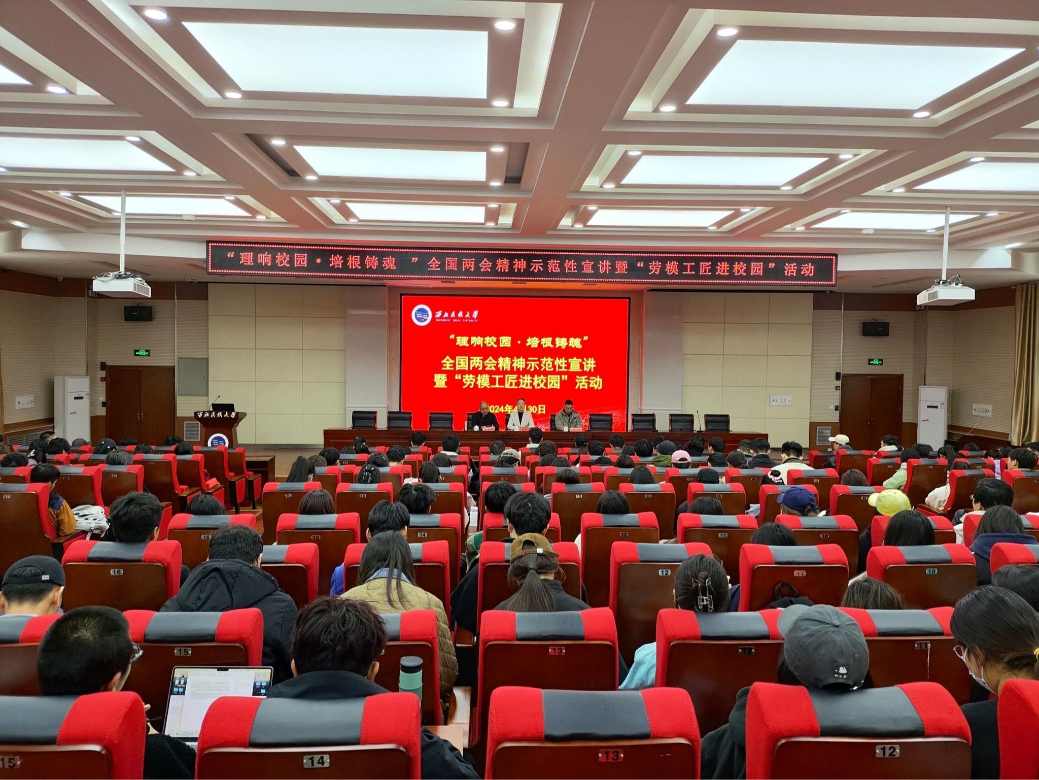 4月30日,青马学员参加了在致真楼125学术报告厅举办的“理响校园·培根铸魂”全国两会精神示范性宣讲暨“劳模工匠进校园”活动。宣讲会上,学校马克思主义学院甄喜善教授,十三届、十四届全国人大代表、全国劳动模范梁倩娟,马克思主义学院研究生魏斌分别以《以新质生产力推进中国式现代化》《劳动不息,奋斗不止》《勇做走在时代前列的好青年》为题,紧紧围绕习近平总书记在全国两会期间发表的重要讲话精神,聚焦习近平总书记关于新质生产力的重要论述,聚焦习近平总书记对教育强国建设的全局部署,结合个人工作学习经历,带领青马学员深入学习领会全国两会精神。