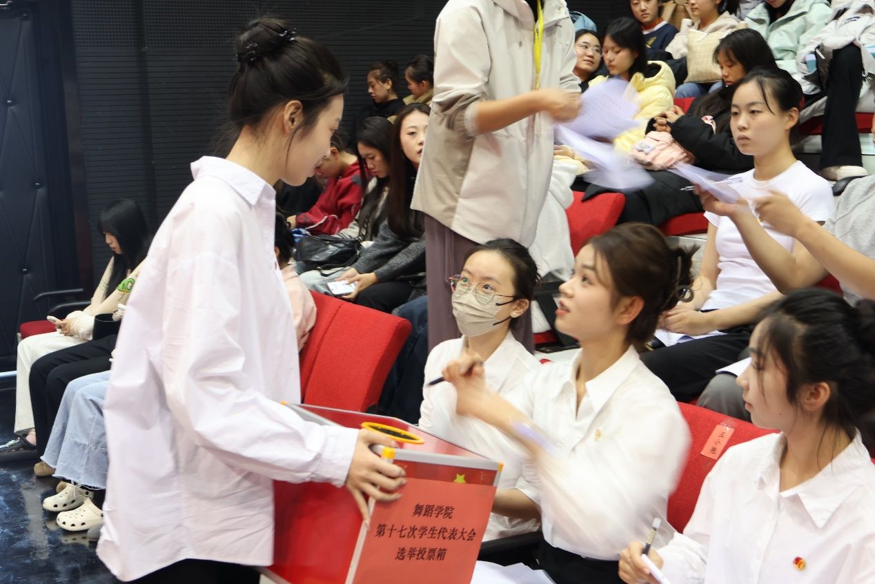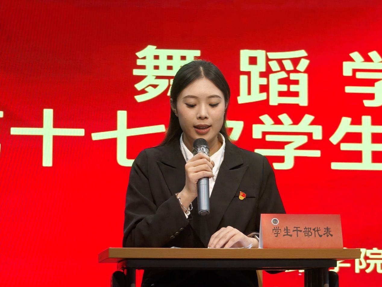舞蹈学院第十六届学生会主席团成员向文杰同学向大会作了报告,全面回顾了过去一年学生会在思想引领、学业促进、校园文化建设、志愿服务等方面取得的成绩。