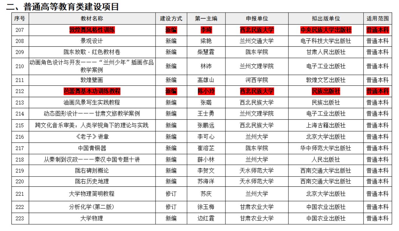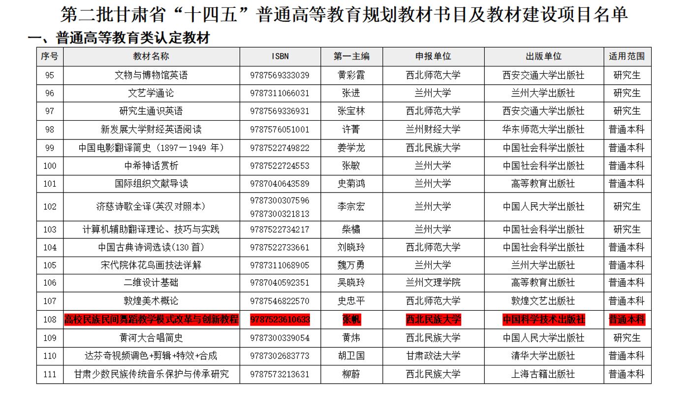 近日,甘肃省教育厅公布第二批甘肃省“十四五”普通高等教育、职业教育规划教材书目和建设项目名单。西北民族大学舞蹈学院三部教材成功入选,充分彰显了学院在舞蹈教育领域的学科实力与教学创新成果。