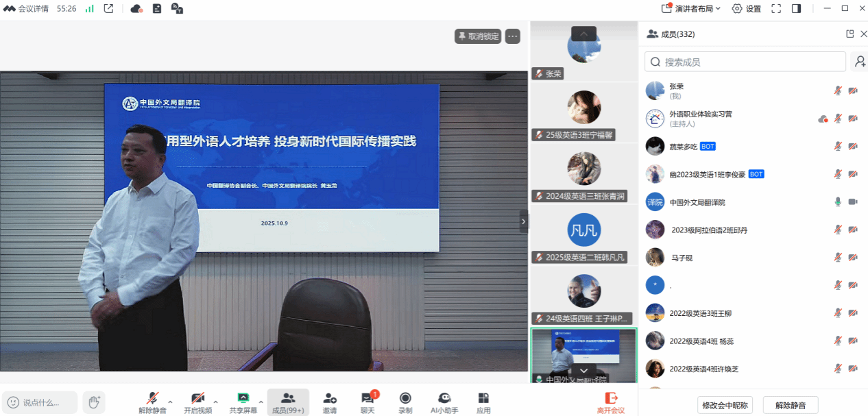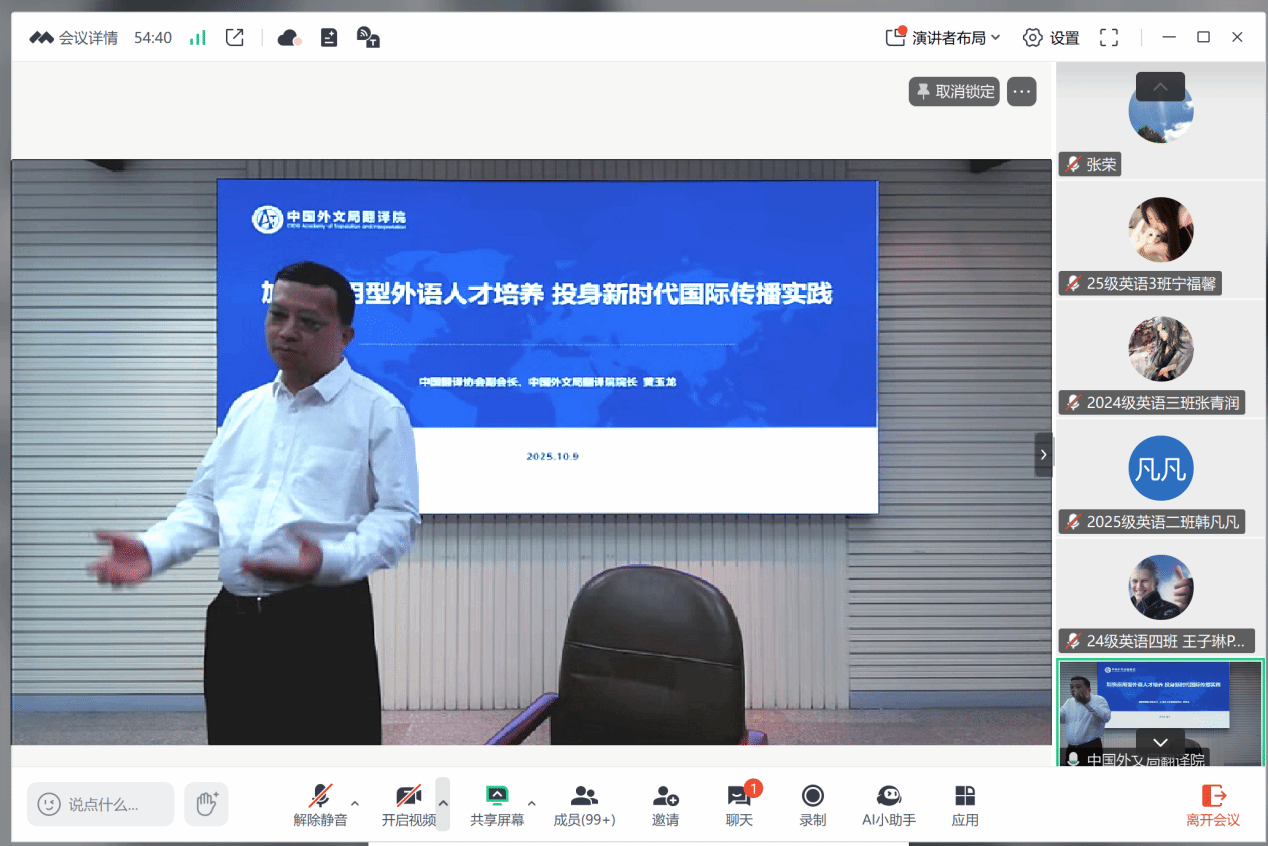 10月9日晚,中国翻译协会副会长、中国外文局翻译院院长黄玉龙受邀为学院师生开展了一场题为《加快应用型外语人才培养 投身新时代国际传播实践》的学术讲座。讲座由学院副院长张荣主持,历时两个多小时,学院专业教师、研究生、本科生共330多人参加。