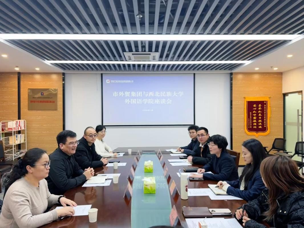 2026年1月23日,西北民族大学外国语学院党委书记先巴东知一行到访贵阳市外贸发展集团有限公司,双方围绕多语种外贸人才培养、校企合作机制建设等核心议题开展深度座谈交流。市外贸集团副总经理赵杰及相关部门负责人参加座谈。
