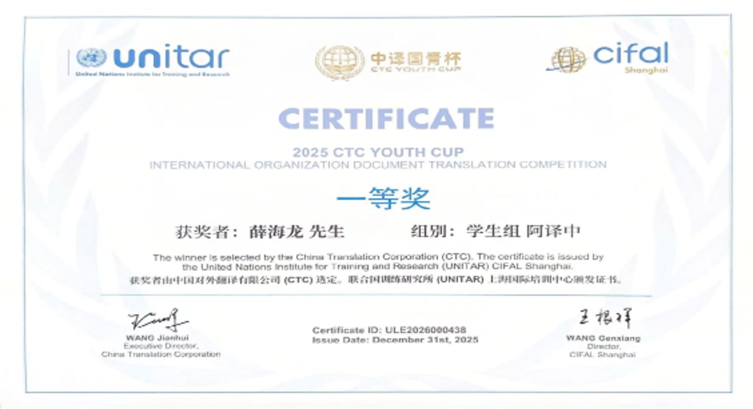 此次获奖,既是对薛海龙个人专业能力的充分肯定,也彰显了我院阿拉伯语专业“以赛促学、实践育人”的良好教学成果。薛海龙表示,将以此次获奖为动力,在翻译学习与语言传播的道路上继续稳步前行。