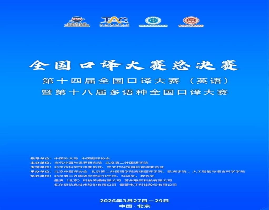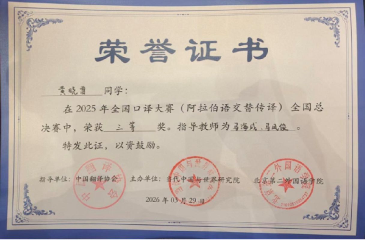为加强新时代高水平翻译人才培养与选拔,推动人工智能时代翻译与语言服务行业创新发展,当代中国与世界研究院、北京第二外国语学院于2025年12月至2026年3月举办第十四届全国口译大赛(英语)暨第十八届多语种全国口译大赛。经过激烈角逐,西北民族大学外国语学院翻译硕士阿拉伯语笔译专业参赛选手黄晓雷表现优异,在2026年3月29日进行的阿拉伯语交替传译全国总决赛中荣获三等奖。