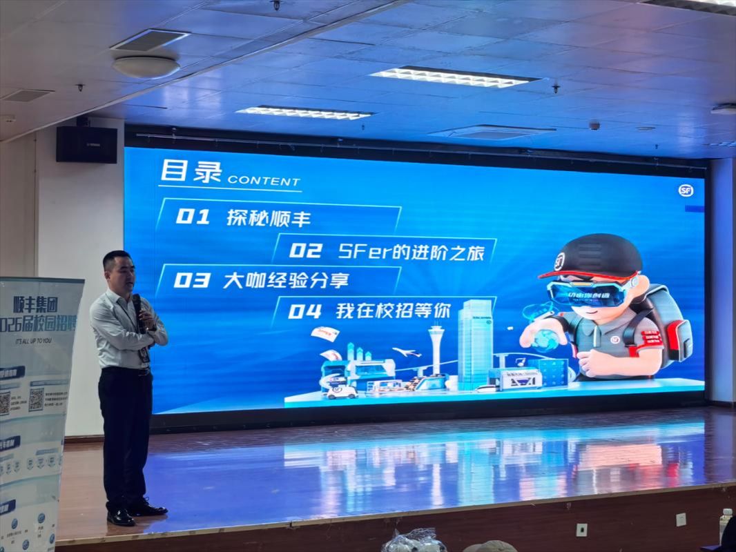 为精准搭建校企人才对接桥梁,拓宽毕业生就业渠道,助力学子精准对接优质岗位,4月14日,外国语学院和管理学院在就业大厅联合举办顺丰集团2026届专场校园招聘宣讲会。顺丰集团甘青宁区域代表李林宣、钱彦彪、潘万东,学生工作处副处长孙向涛,外国语学院党委副书记马佳、辅导员康维华及两院2026届全体毕业生参加此次活动。