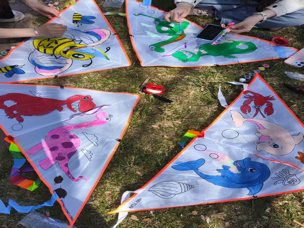 现场春意盎然,工作人员提前备齐创作材料,细致讲解风筝绘制、组装技巧及放飞注意事项。同学们围坐草坪以笔绘心,或勾勒春日盛景,或书写励志短句,焦虑与疲惫在创作中悄然消散。创作完成后,大家手持风筝线迎风奔跑欢呼,彩色纸鸢次第升空,承载着青春梦想与未来憧憬,每一次放线都是压力的释放与心灵的舒展。