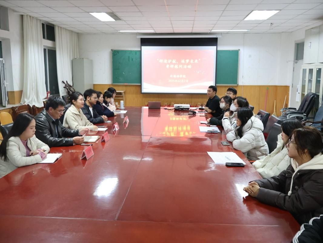 2025年12月2日,外国语学院“研途护航·逐梦未来”考研慰问活动在致美楼316会议室举行。学院党委书记先巴东知、团委书记袁嘉、教学秘书李嘉怡、研究生辅导员康涛以及2022级考研学生共同参与此次活动。