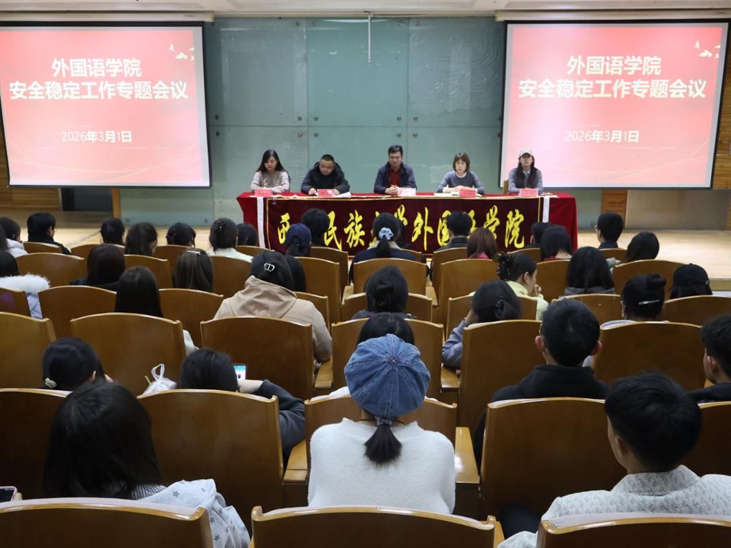 为切实筑牢校园安全防线,压实压紧安全稳定工作责任,确保新学期各项工作平稳有序推进,外国语学院2026年3月1日召开新学期安全稳定工作专题会议。学院班子成员、全体辅导员、班导师参加会议,会议由学院党委副书记马佳主持