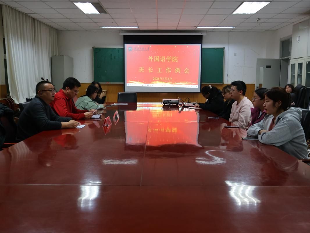 为扎实做好新学期学生工作,进一步加强班级建设与管理,2026年3月2日晚,外国语学院于致美楼316会议室召开2025-2026学年第二学期班长工作例会。学院党委书记先巴东知、副处级辅导员黎林出席本次会议,与全体班长同聚会议室,共谋班级发展新路径。