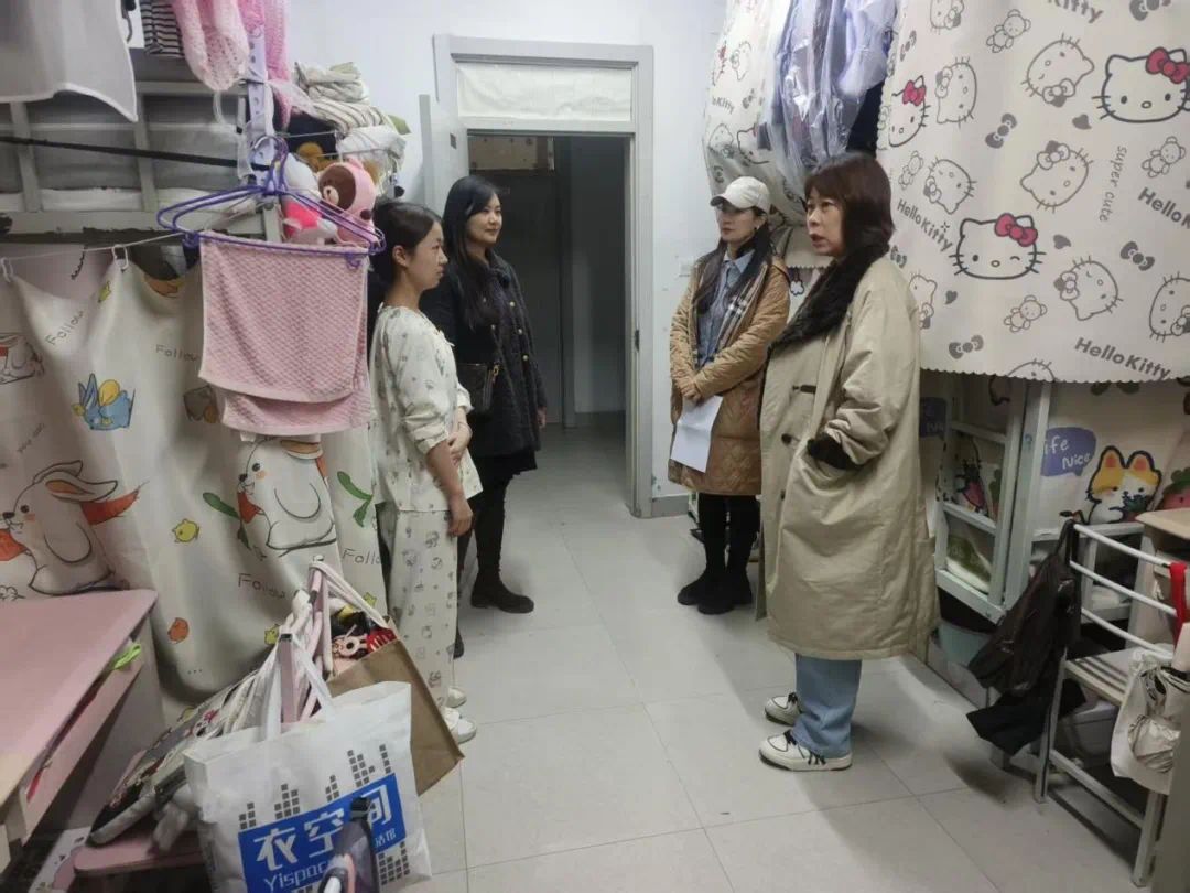 走访过程中,老师们以亲切问候替代严肃批评,用细致叮嘱取代生硬检查,氛围温馨融洽。老师们逐一查看宿舍卫生环境、用电安全、门窗设施等情况,全面排查安全隐患,耐心叮嘱同学们严格遵守宿舍管理规定,规范用电行为、整理内务卫生,共同营造安全、整洁、舒适的居住空间。