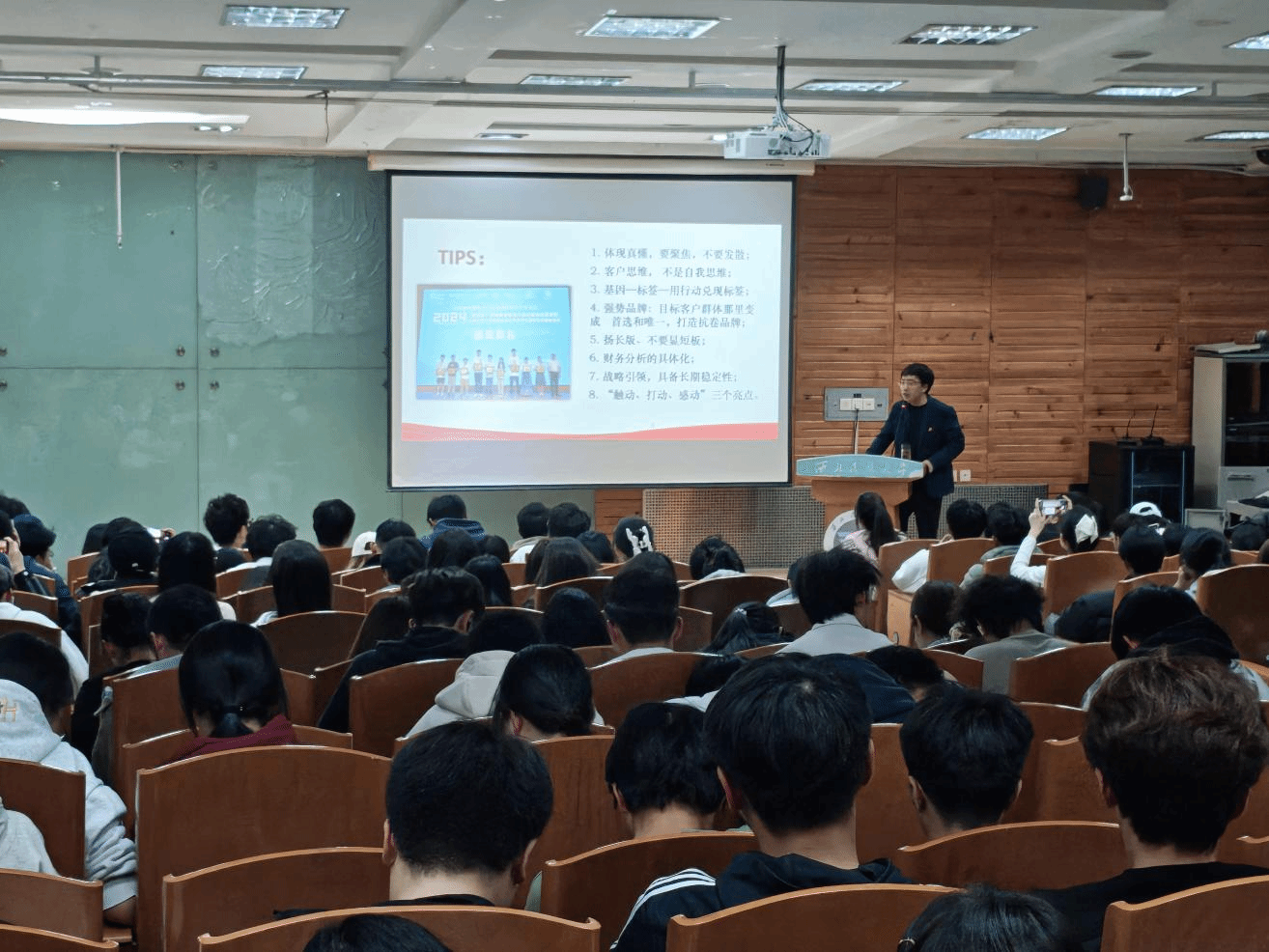 马永腾老师结合多年指导国家级竞赛的经验,通过详实的数据分析和项目展示,深入剖析了高水平学科竞赛的考察重点。他从项目选题、团队组建到材料打磨、现场答辩等环节倾囊相授,强调参赛项目应注重挖掘中华优秀传统文化内涵,发挥学校在铸牢中华民族共同体意识方面的优势,突出竞赛项目的实用价值和社会效益。杨烨同学分享了在全国商业精英挑战赛品牌策划竞赛中的夺冠经历。他坦言自己曾多次在校赛、省赛中失利,但正是这些挫折铸就了永不言弃的信念,也让他明白成功的竞赛项目无论是申报书排版设计还是项目构思都需要极致的细节打磨。