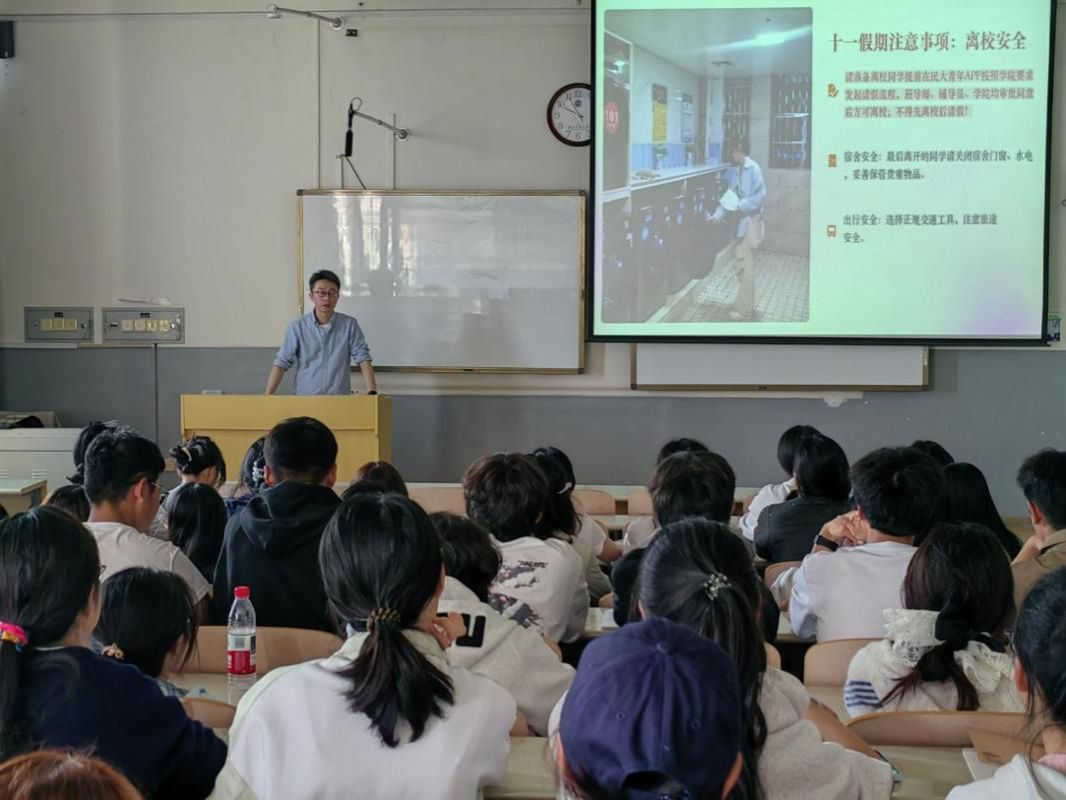 班会还详细安排了十一假期安全注意事项。离校学生要严格请销假,严格遵守校纪校规,强调了交通安全、人身财产安全、网络安全等内容。班会要求留校学生须遵守宿舍管理规定,杜绝晚归、夜不归宿及使用违规电器。