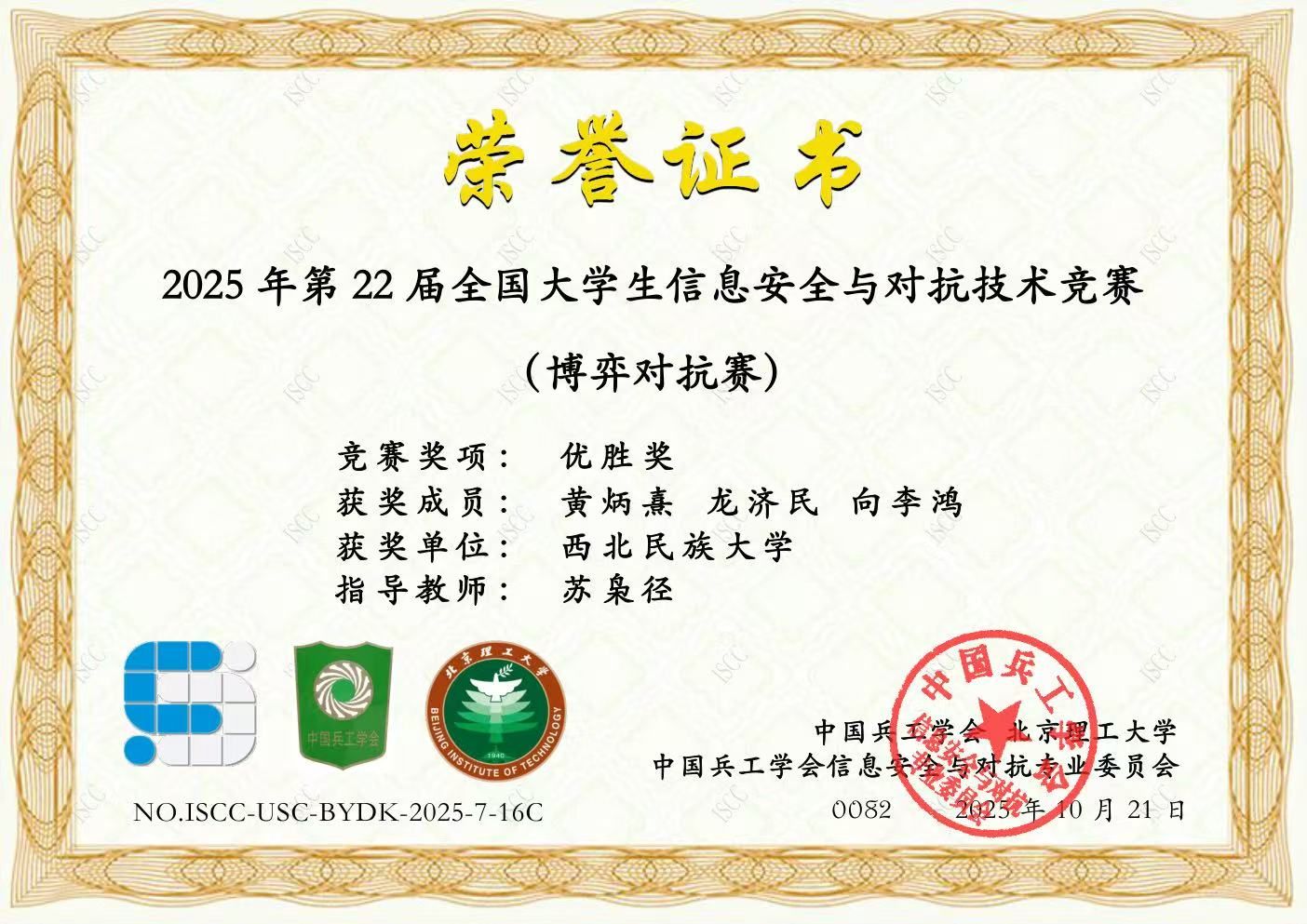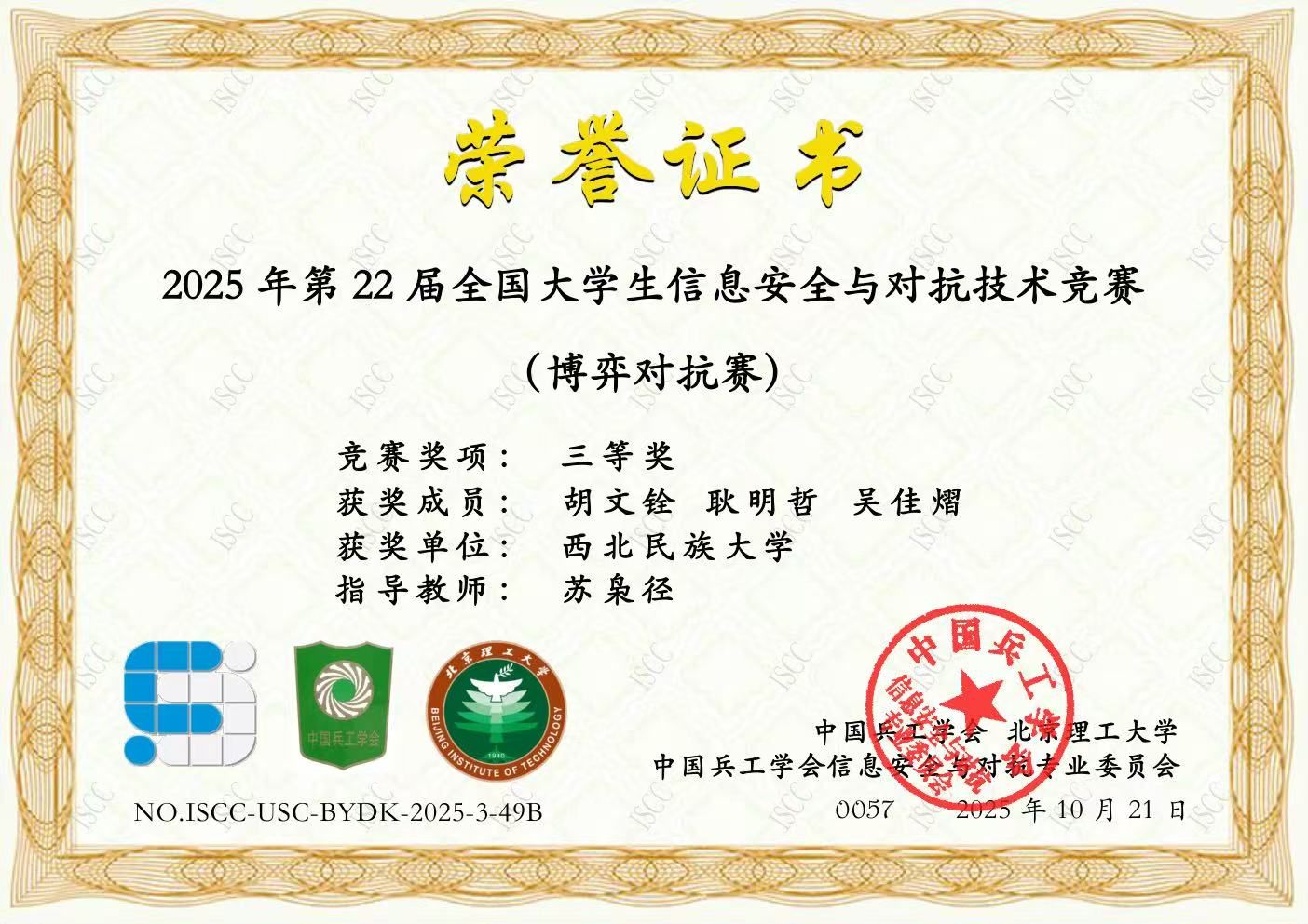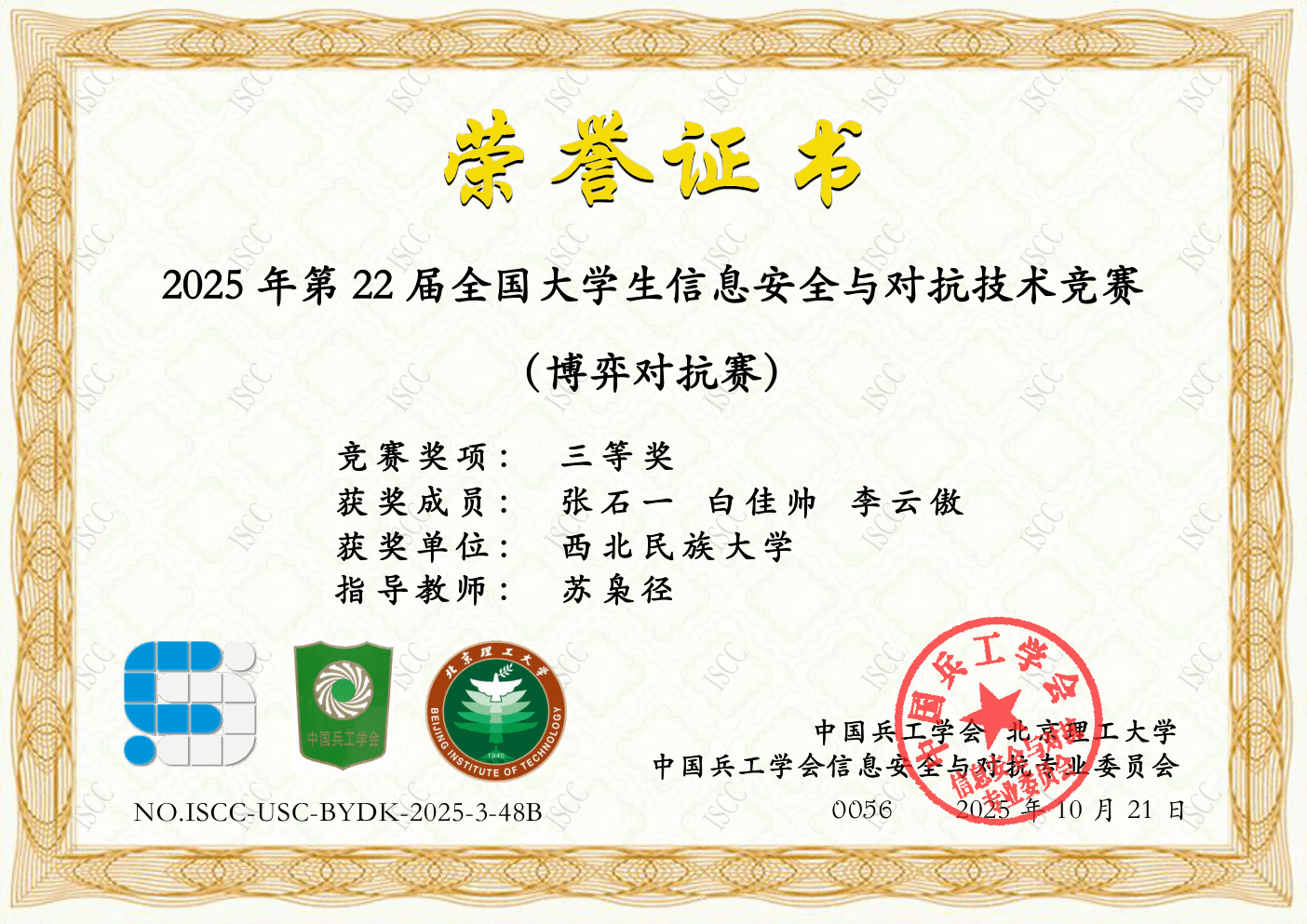喜报!学校学子在第22届全国大学生信息安全与对抗技术竞赛(博弈对抗赛)中喜获佳绩 作者:苏枭径 编辑:焉秋瑶 校审: 审签: 赵琦 发布时间:2025-11-10 浏览次数: 近日,第22届全国大学生信息安全与对抗技术竞赛(简称ISCC)获奖名单揭晓。信息化建设工作处联合数学与计算机科学学院,以“部门指导+学院选才”的合作模式组建参赛团队,凭借扎实的信息安全专业功底与稳定的实战对抗能力,斩获博弈对抗赛全国三等奖2项、优胜奖1项。 此次获奖不仅是对参赛学子刻苦钻研、勇于挑战精神的肯定,更彰显了学校在信息对抗与网络安全领域的教学成果。学校将以此为契机,鼓励师生积极参与高水平专业赛事,在以赛促学、以赛促练中提升专业能力。 下一条:学校召开2026年校园信息化建设软件项目评审会